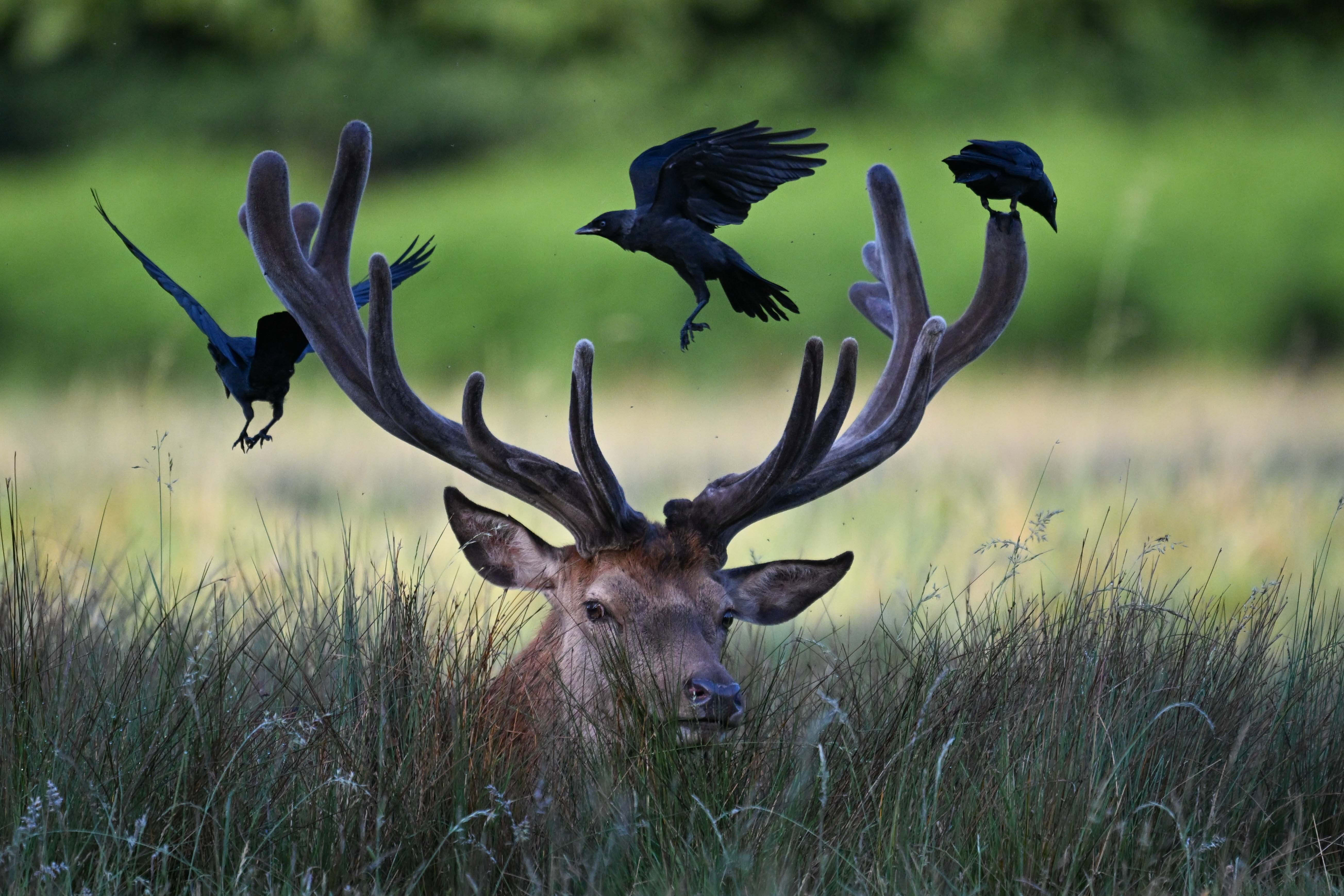 Birds are seen perching on the antlers of a deer in Bushy Park, London, United Kingdom, on June 13, 2025. The rare and peaceful interaction between species highlights the harmony of wildlife in the early morning light. (Photo by Rasid Necati Aslim/Anadolu via Getty Images)