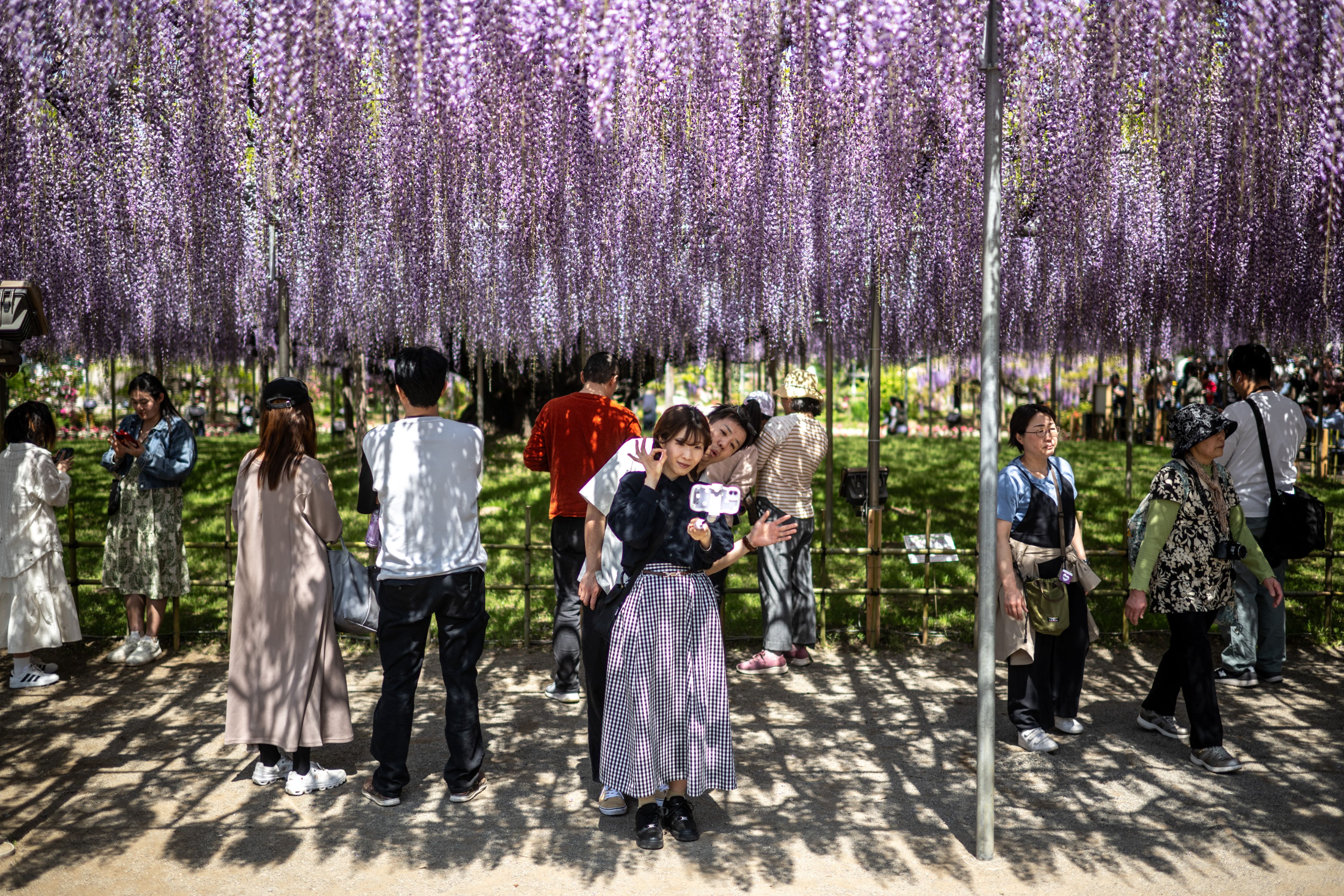 People take pictures underneath wisteria flowers at Ashikaga flower park in Ashikaga city, Tochigi Prefecture, north of Tokyo on April 27, 2025. (Photo by Philip Fong/AFP Photo)