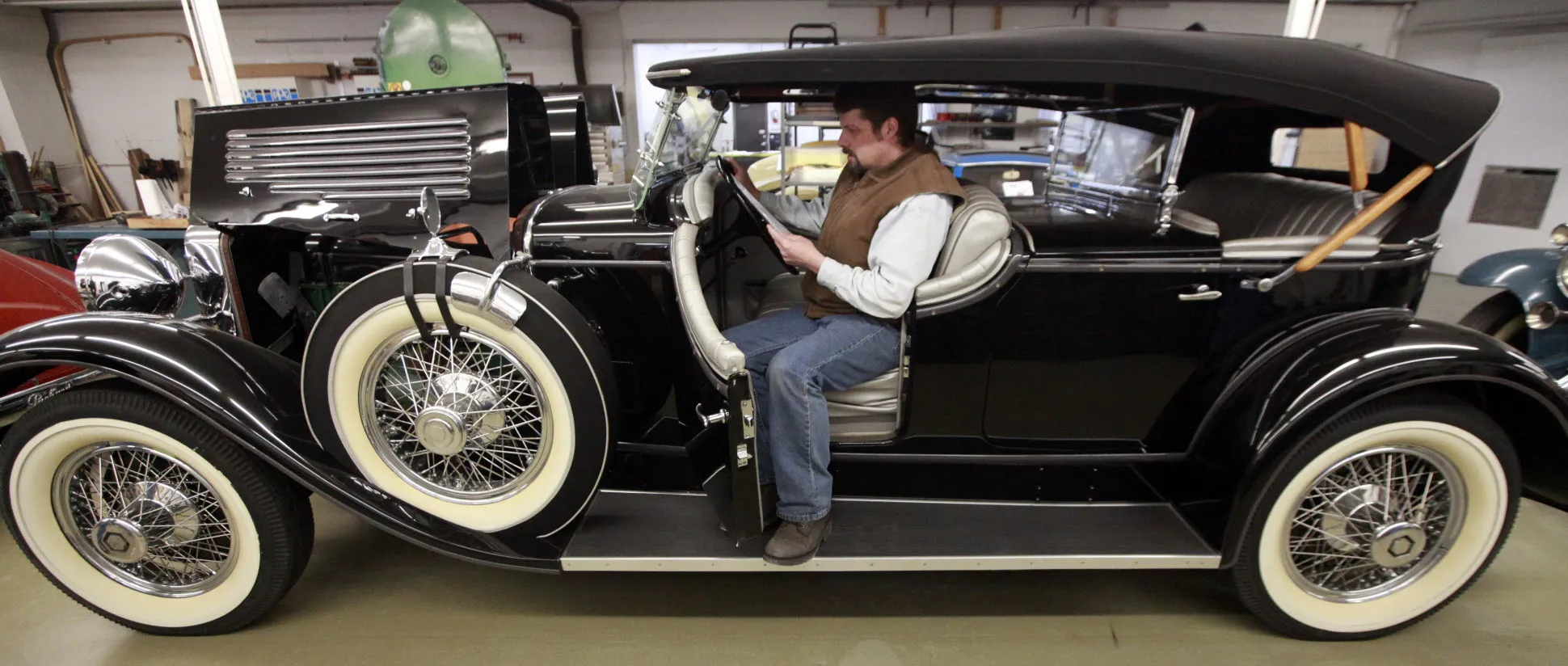Wayne Reeves checks the paperwork of a 1929 Stutz SV16 Dual Cowl Phaeton Tuesday, March 5, 2013 at L'Cars Automotive Specialties in Cameron, Wis. The company which does high-end restoration and customization work classic cars that have won awards at the world-renowned Pebble Beach Concours d'Elegance. Winning cars include a 57c Bugatti, Rolls Royce PIII V12, V12 Aero coupe, T44 Bugatti, T55 Bugatti, T38A Bugatti, Mercedes Benz 290 Roadster, Rolls Royce Silver Ghost, T57 Bugatti, 1929 Duesenberg J, Mercedes Benz 540K cabriolet, Talbot Teardrop and a 1931 V16 Cadillac convertible. (Photo by Mark Hoffman)