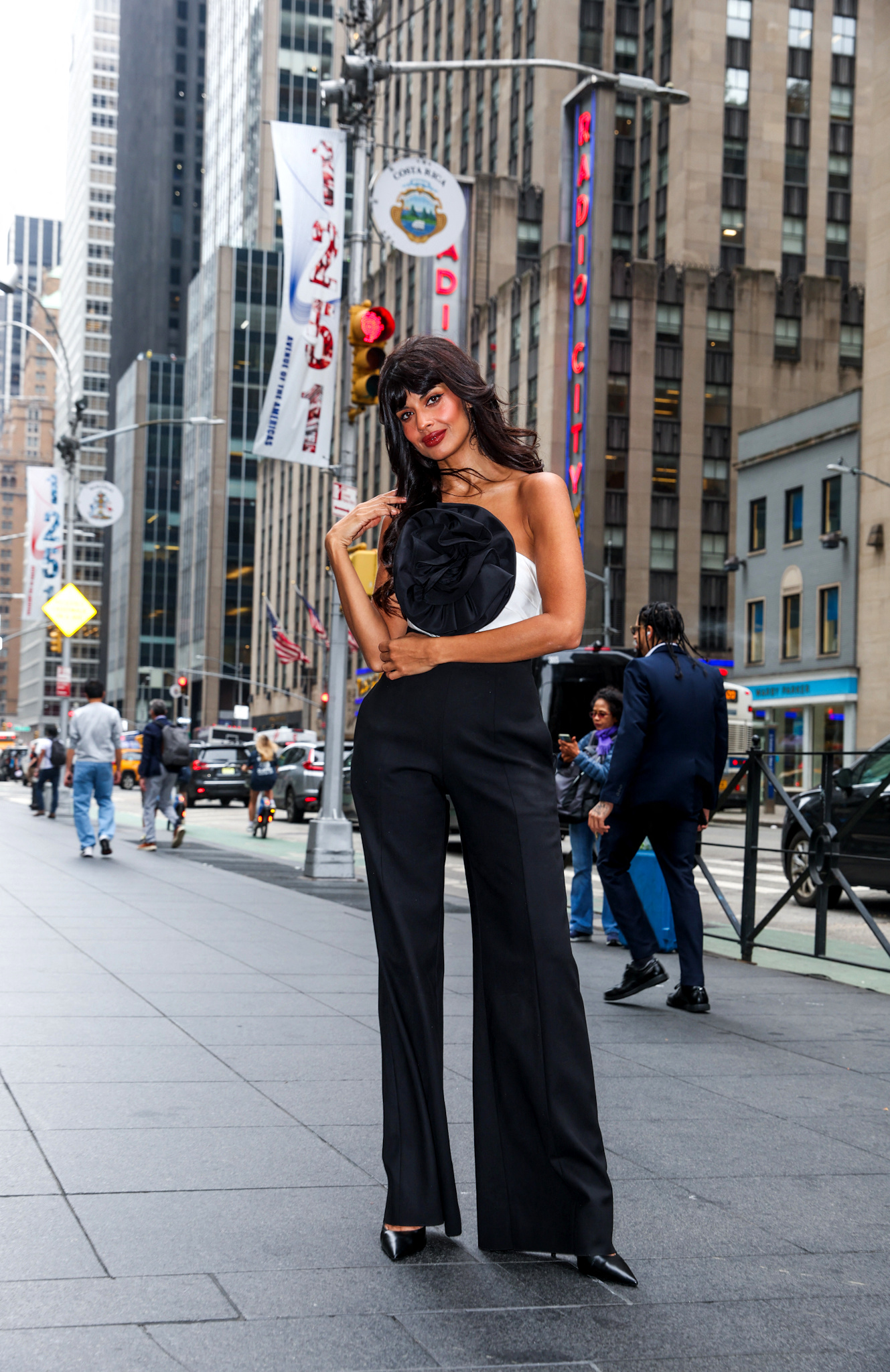 English actress Jameela Jamil is seen posing in front of Radio City Music Hall this afternoon in New York City on June 26, 2025. (Photo by Eric Kowalsky/The Mega Agency)
