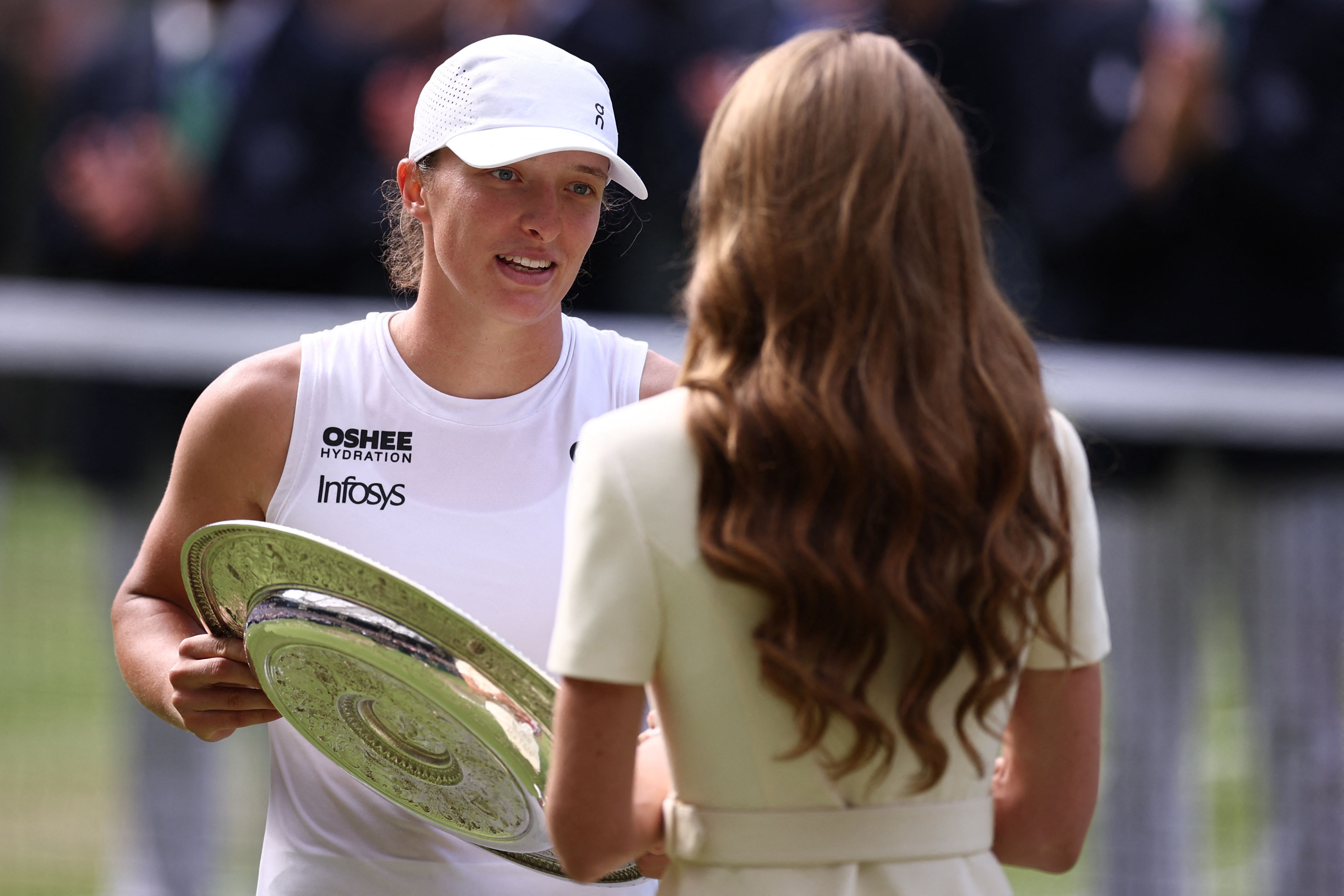 Britain's Catherine, Princess of Wales gives the winner's trophy, the Venus Rosewater Dish, to Poland's Iga Swiatek (L) after her victory against US player Amanda Anisimova at the end of their women's singles final tennis match on the thirteenth day of the 2025 Wimbledon Championships at The All England Lawn Tennis and Croquet Club in Wimbledon, southwest London, on July 12, 2025. (Photo by Henry Nicholls/AFP Photo)