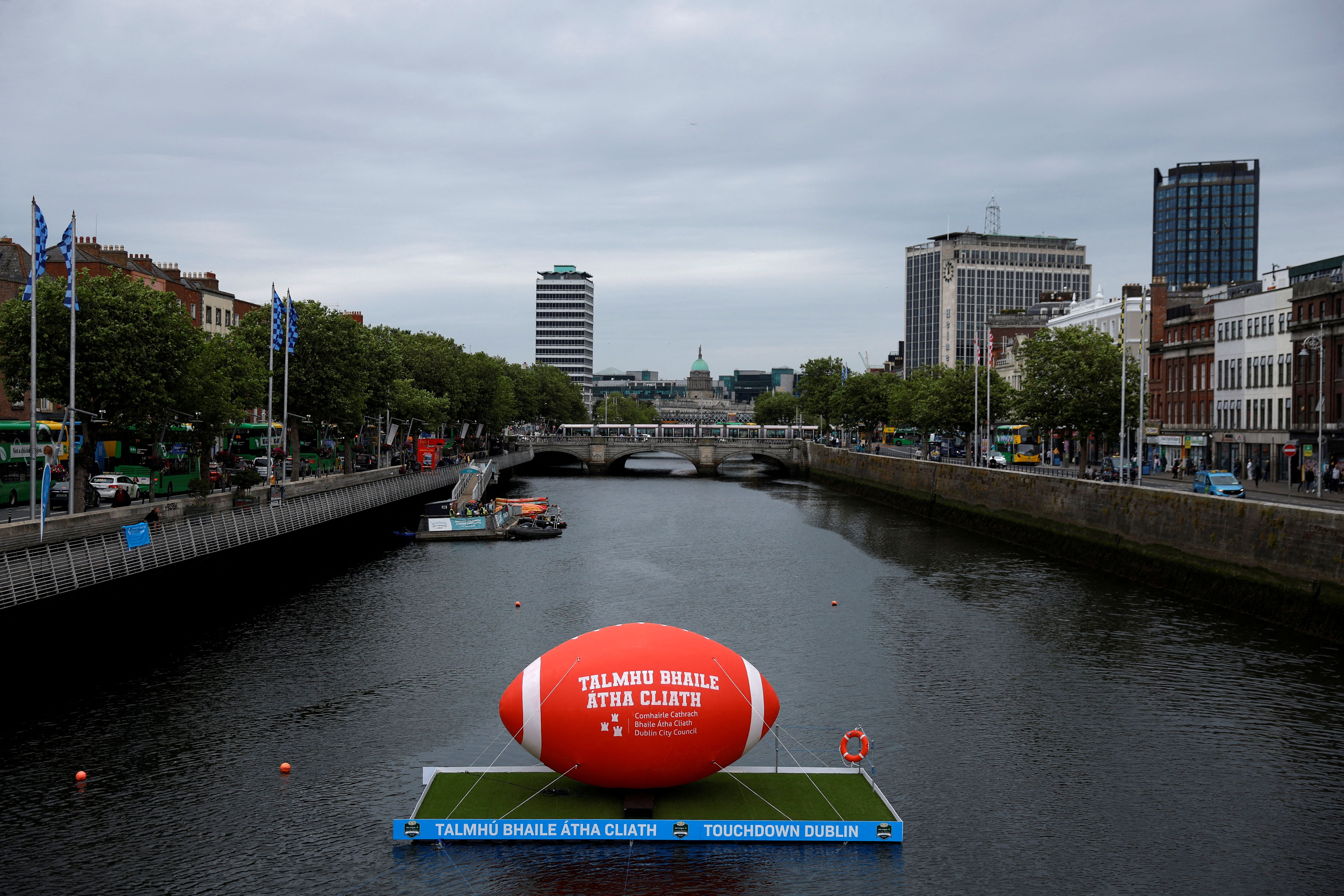A giant American football floats on a pontoon on the river Liffey, ahead of a game of American football between K-State and Iowa State being held at the Aviva Stadium, in Dublin, Ireland, on July 4, 2025. (Photo by Clodagh Kilcoyne/Reuters)