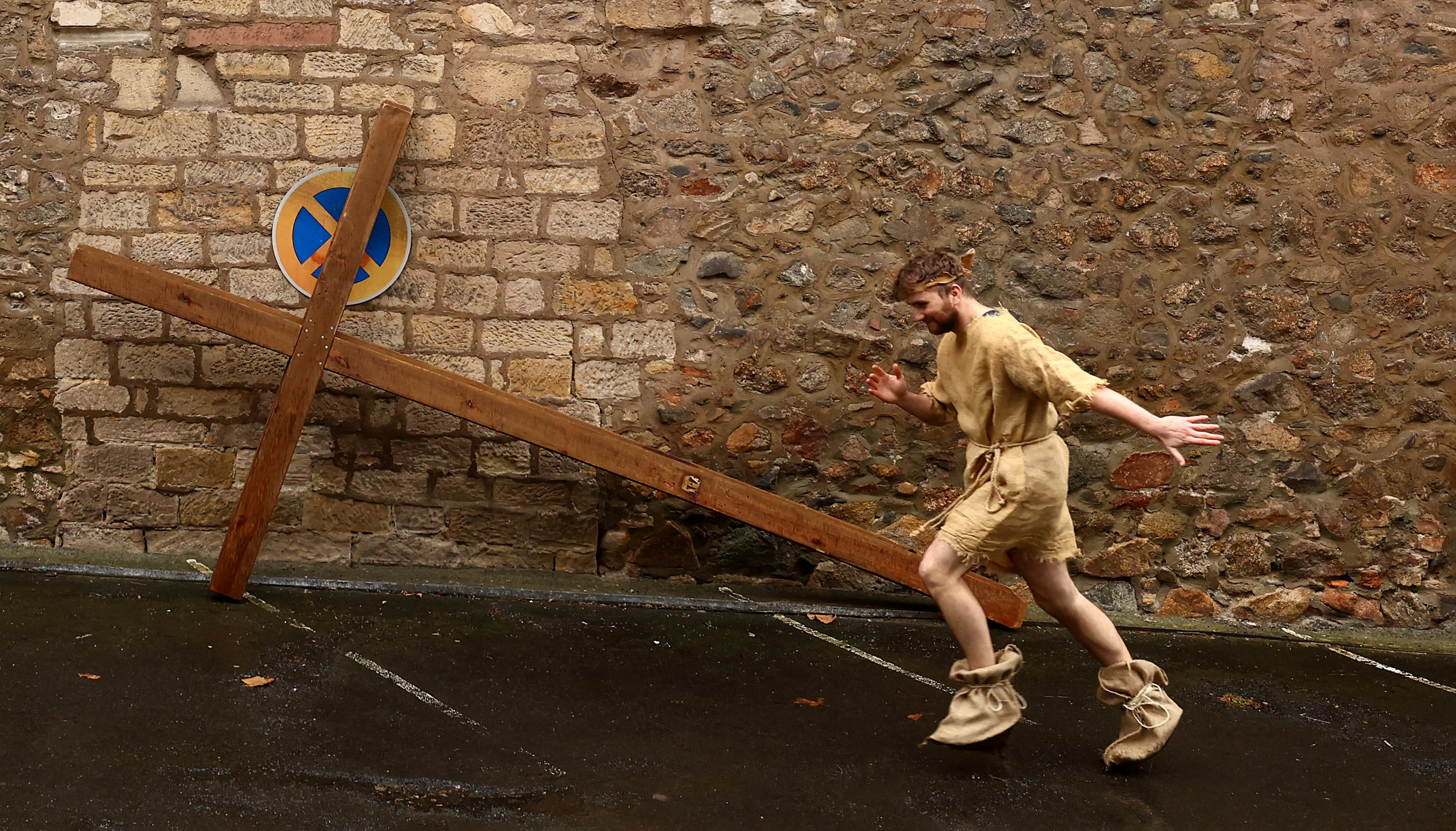 A member of the Italian community takes part in a re-enactment of the crucifixion of Jesus Christ on Good Friday in Bensheim, southwest of Frankfurt, Germany, on March 29, 2024. (Photo by Kai Pfaffenbach/Reuters)