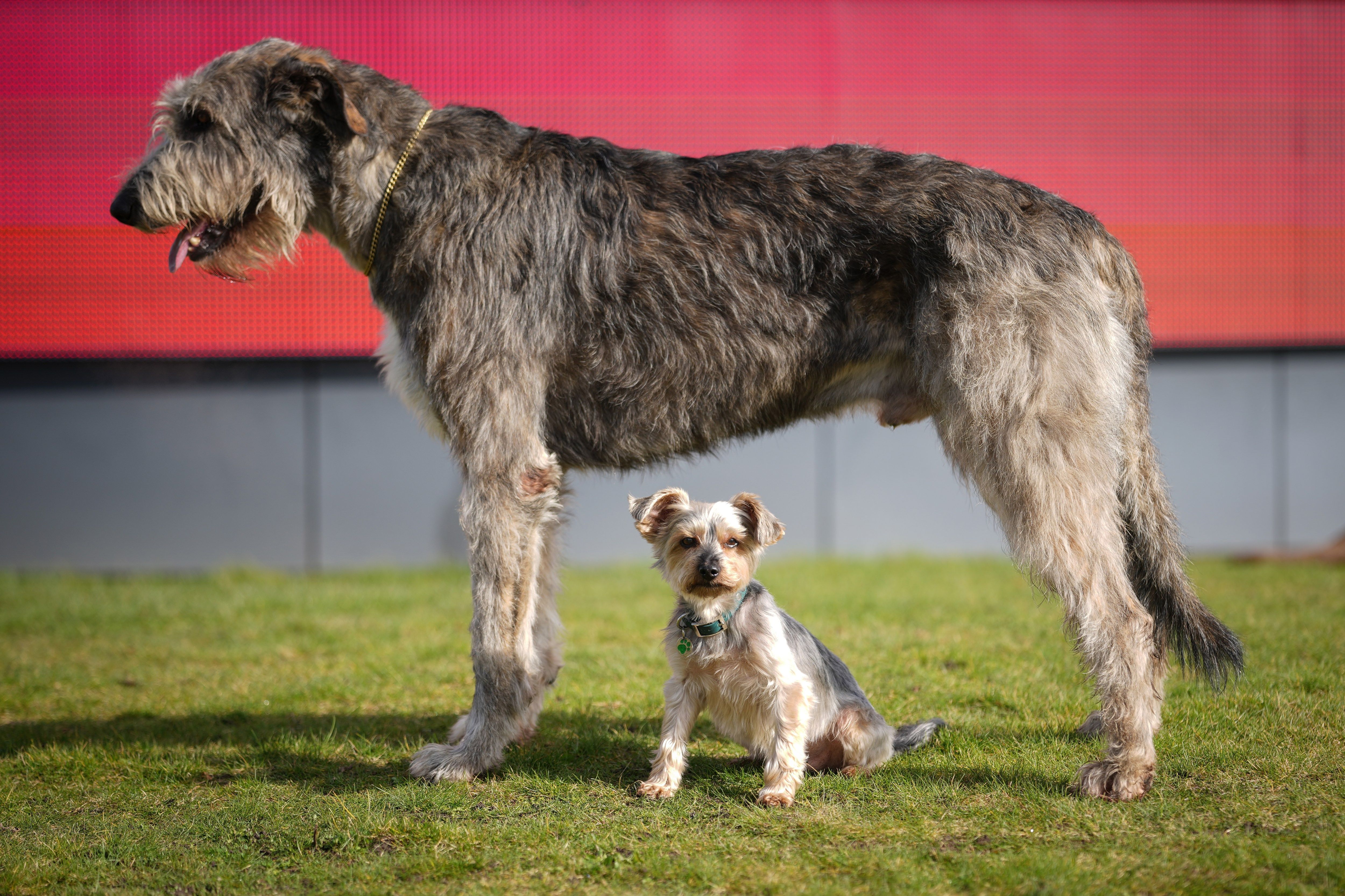Dougal, a 10 year old Yorkshire Terrier and member of the ‘Good Citizen’ display team meets up with two year old Irish Wolfhound Killoughery Rockefella as they pose for the media during a photocall at NEC Arena to launch Crufts 2024 on March 05, 2024 in Birmingham, England. Over 24,000 dogs are heading to Birmingham to take part in Crufts 2024 which starts on Thursday 7th March. (Photo by Christopher Furlong/Getty Images)