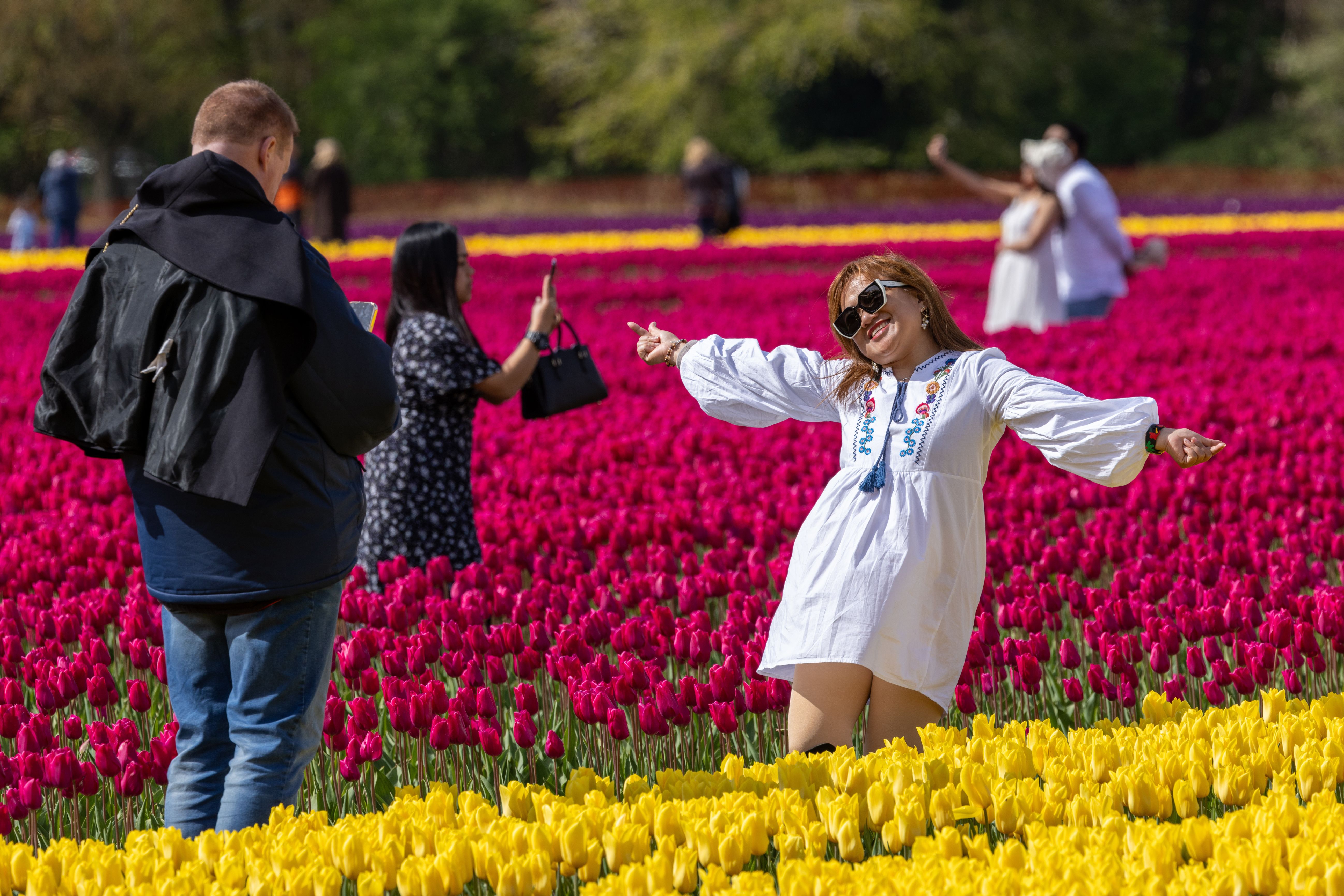 Colourful pictures all round as people pose on April 7, 2025 in the bright rows of tulips at the family-run Norfolk Tulips near King’s Lynn, UK made famous due to being used to recreate the Emerald City in the Wicked film. (Photo by Bav Media)