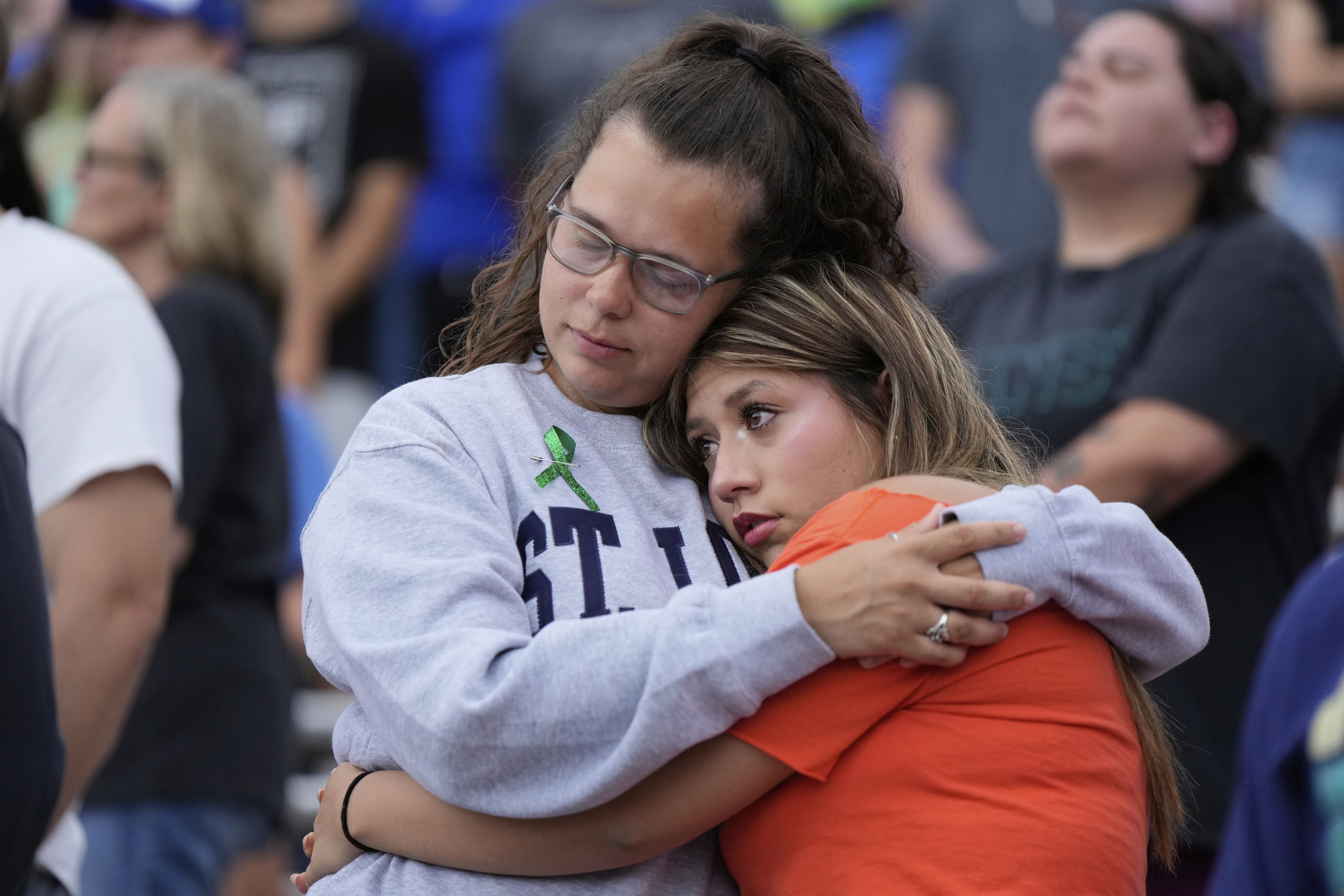 Mourners embrace during a vigil for Guadalupe River flooding victims at Tivy Antler Stadium on Wednesday, July 9, 2025, in Kerrville, Texas. (Photo by Ashley Landis/AP Photo)
