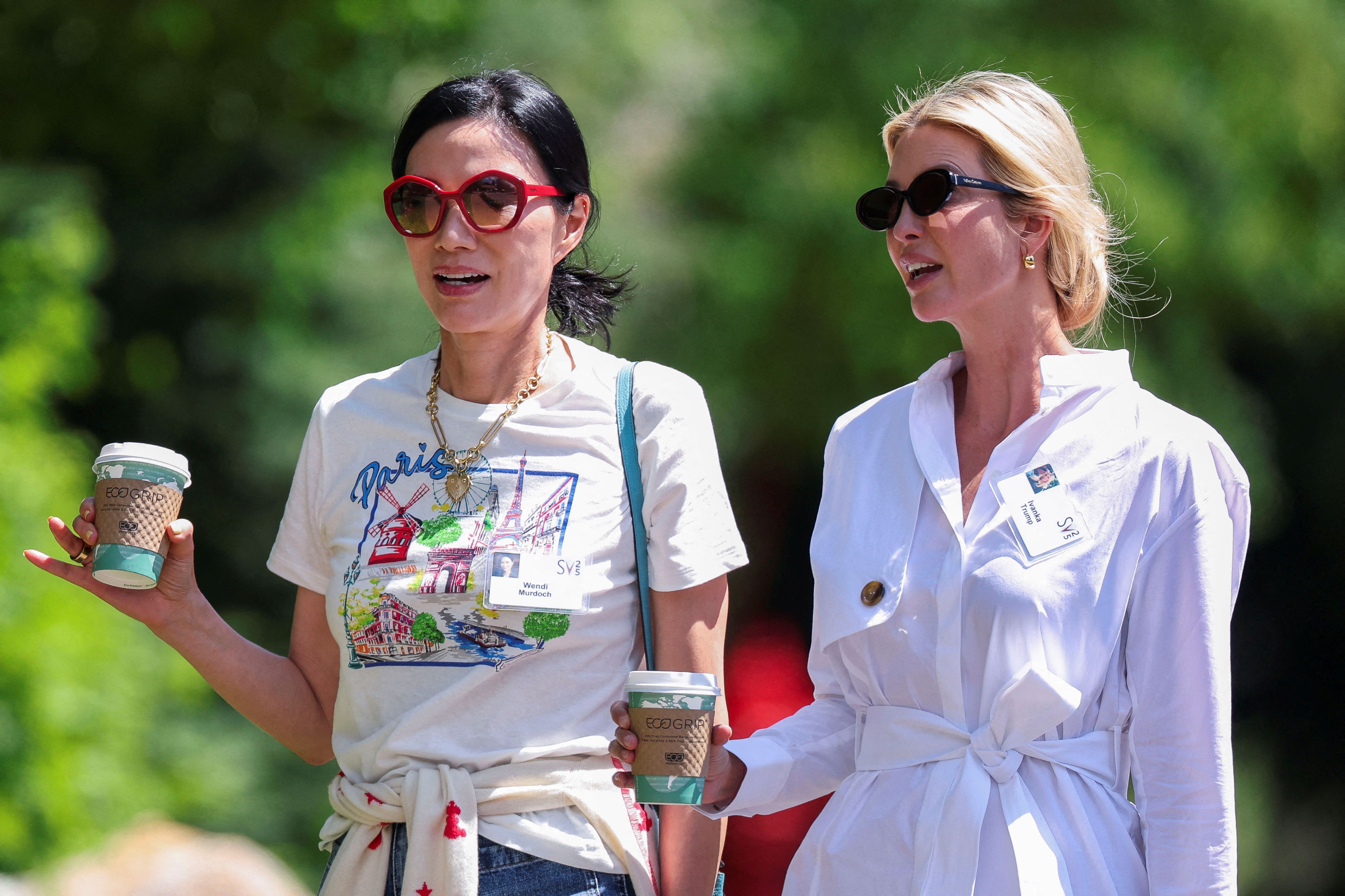 Wendi Murdoch, co-chief executive officer of Big Feet Productions, left, and Ivanka Trump, former senior adviser to Donald Trump, during the Allen & Co. Media and Technology Conference in Sun Valley, Idaho, US, on Thursday, July 10, 2025. The annual event has been a historic breeding ground for media deals and is usually a forum for tech and media elites to discuss the future of their industry. (Photo by Brendan McDermid