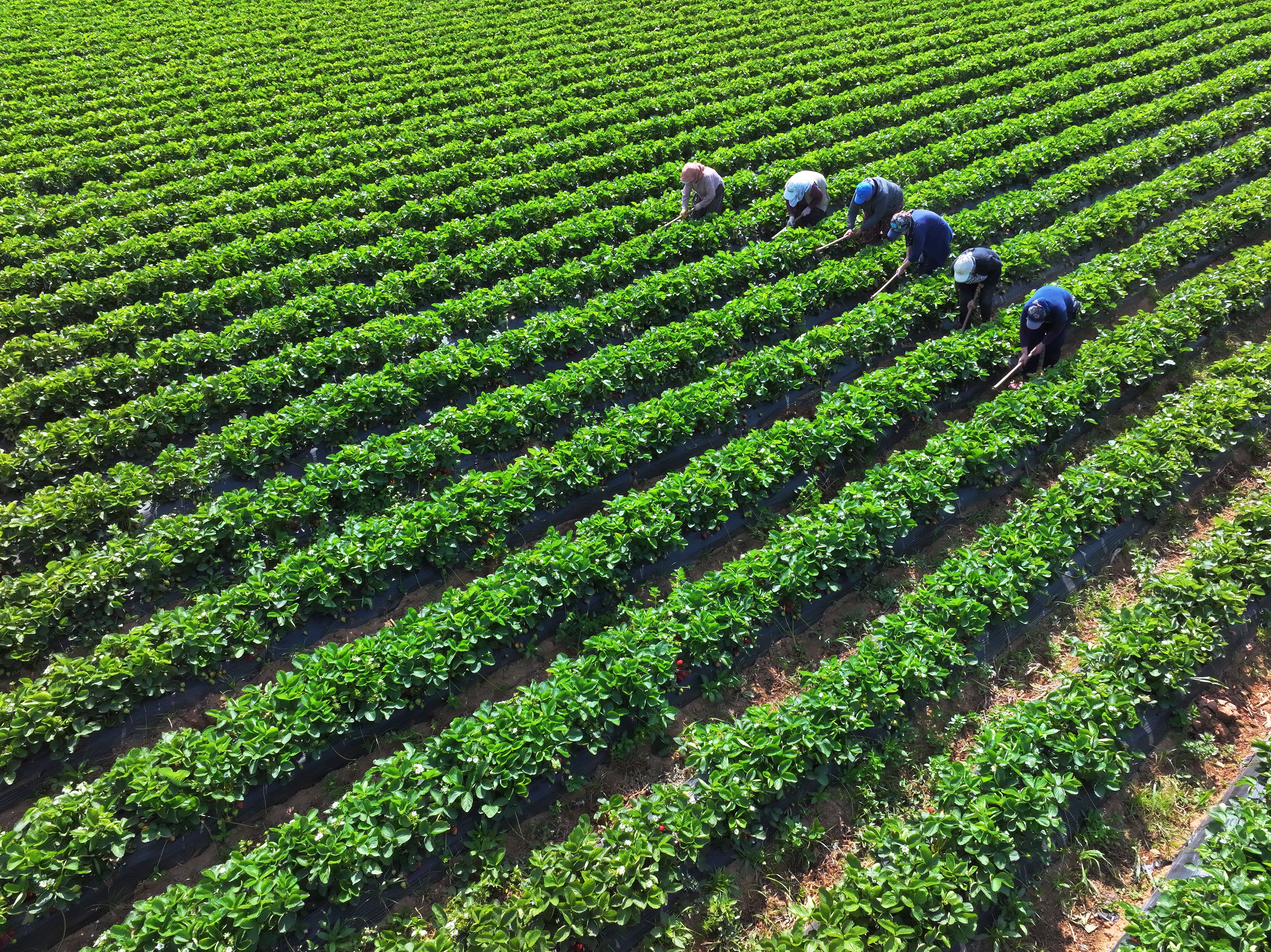 An aerial view of farmers collecting Emiralem strawberries, known for their smell and aroma, harvested 15 days late this year due to the cold in Emiralem neighbourhood in Menemen district of Izmir, Turkiye on April 22, 2025. (Photo by Mehmet Emin Menguarslan/Anadolu via Getty Images)