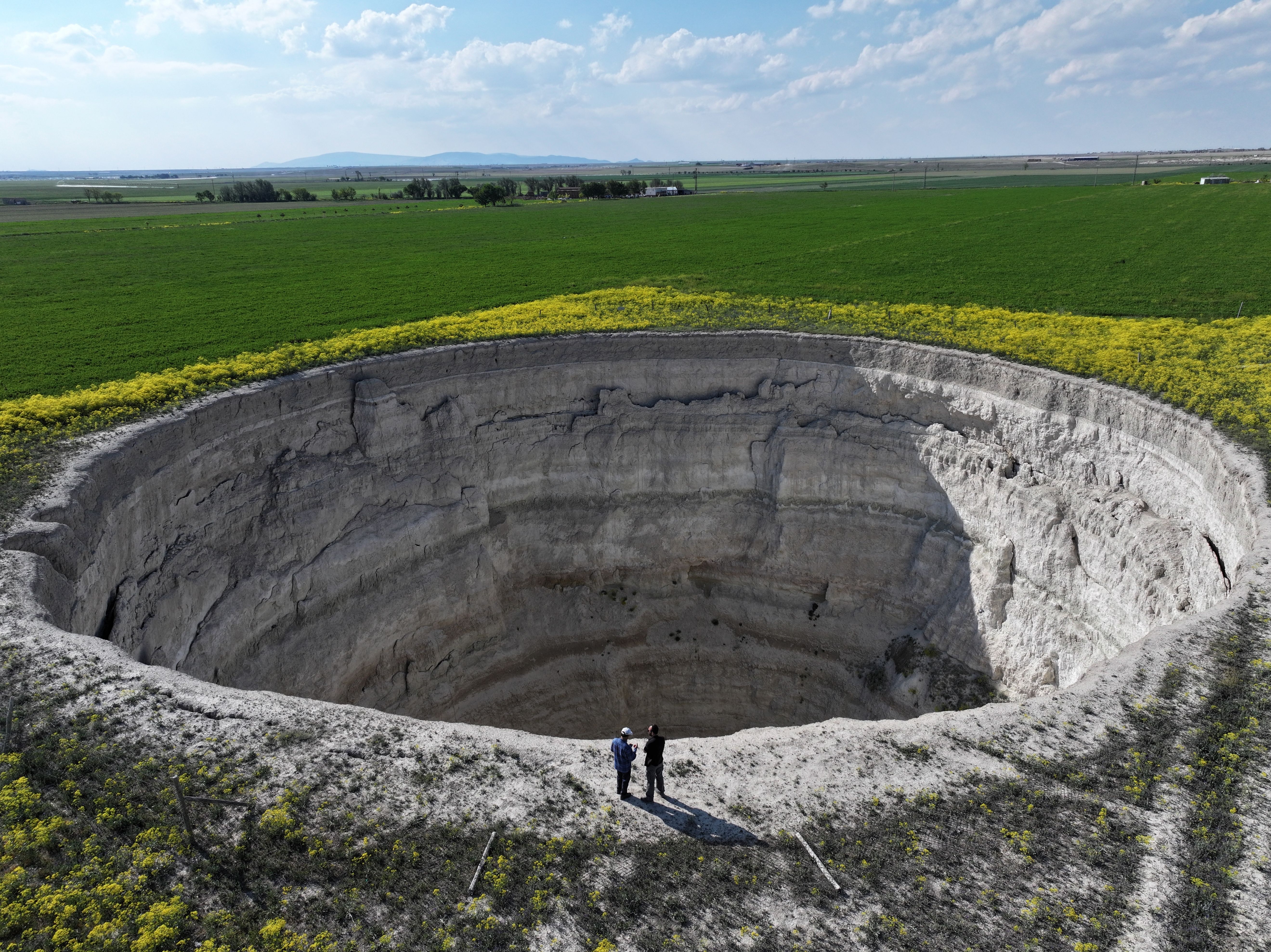 A view of Yarimoglu sinkhole (obruk), caused by some form of collapse of the surface layer in 2009, in Konya province, Turkiye on May 15, 2025. The gigantic pit formed between the fields where intensive irrigation activities are carried out is expanding and growing every year. (Photo by Abdullah Dogan/Anadolu via Getty Images)
