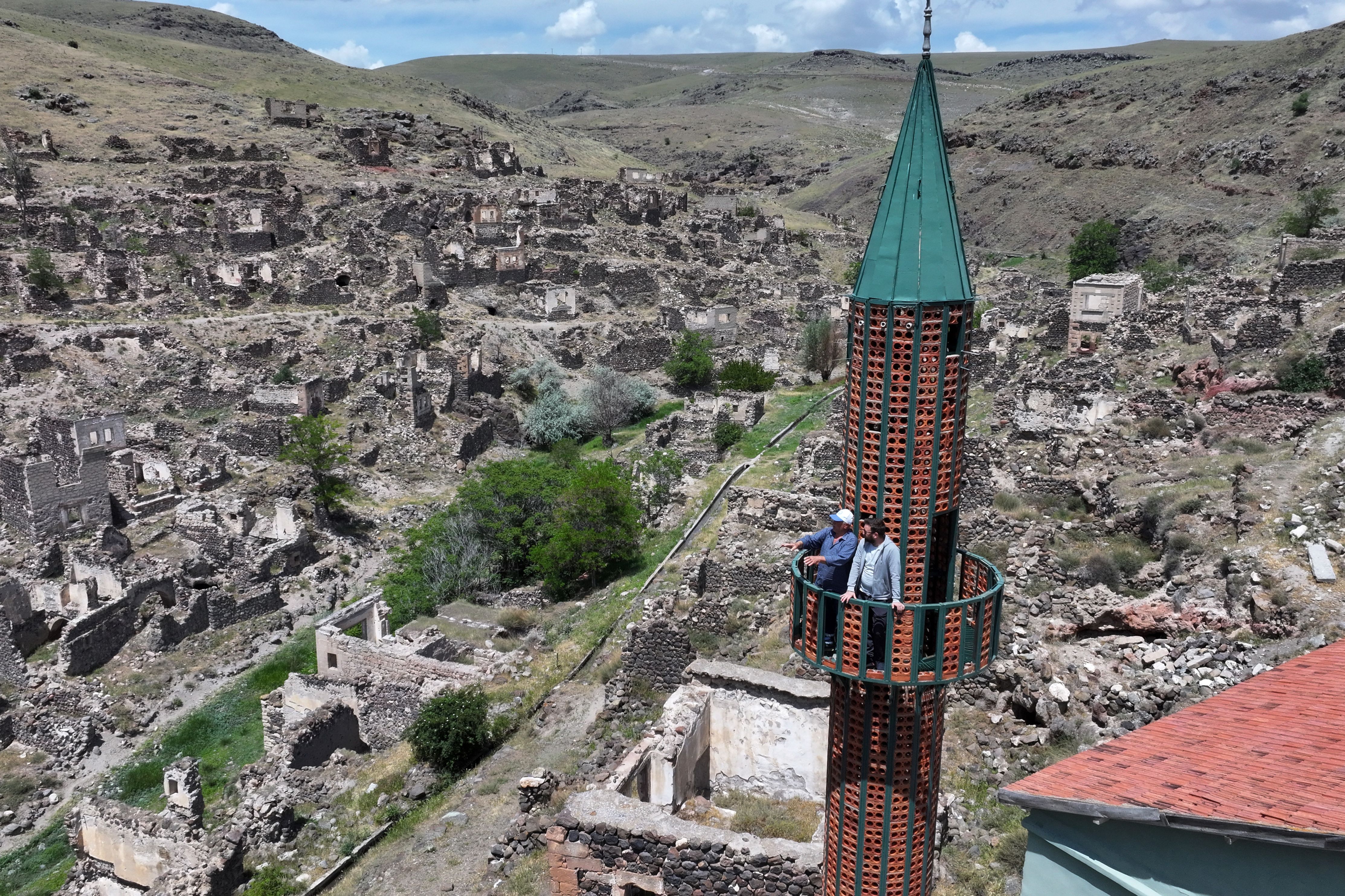 A view of the minaret, which remains standing, visible from Yuvali, a village that was relocated 40 years ago due to flooding, in Kayseri, Turkiye, on May 31, 2025. (Photo by Sercan Kucuksahin/Anadolu via Getty Images)