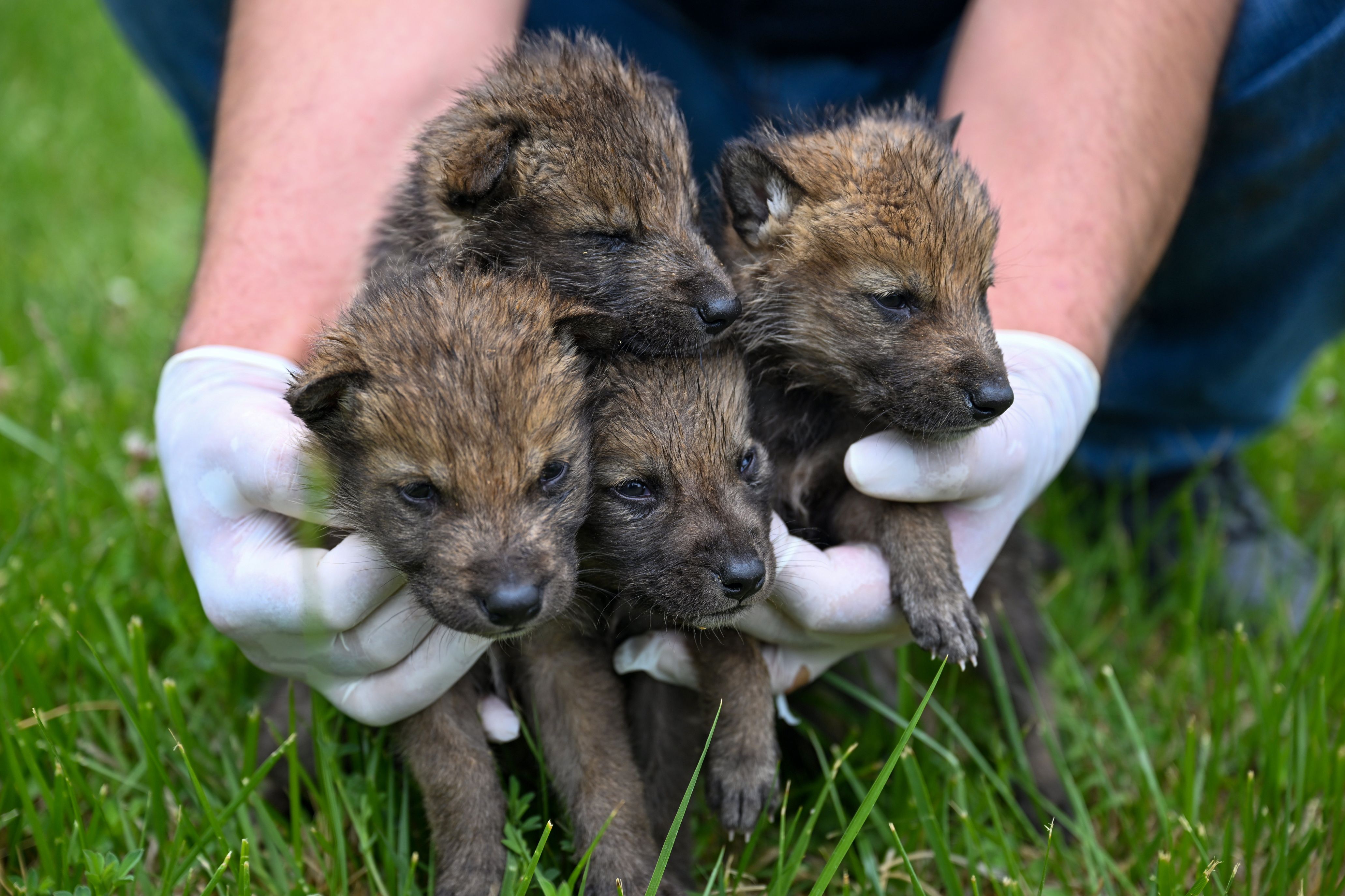 A view of four exhausted wolf pups found in the Iskender Plateau of Karagacli town in Mus as they were taken under protection at the Wildlife Protection and Rehabilitation Center of Van Yuzuncu Yil University (YYU) in Van, Turkiye, on June 5, 2025. The pups were discovered by a local family engaged in livestock farming and handed over to teams from the Directorate of Nature Conservation and National Parks. (Photo by Ozkan Bilgin/Anadolu via Getty Images)