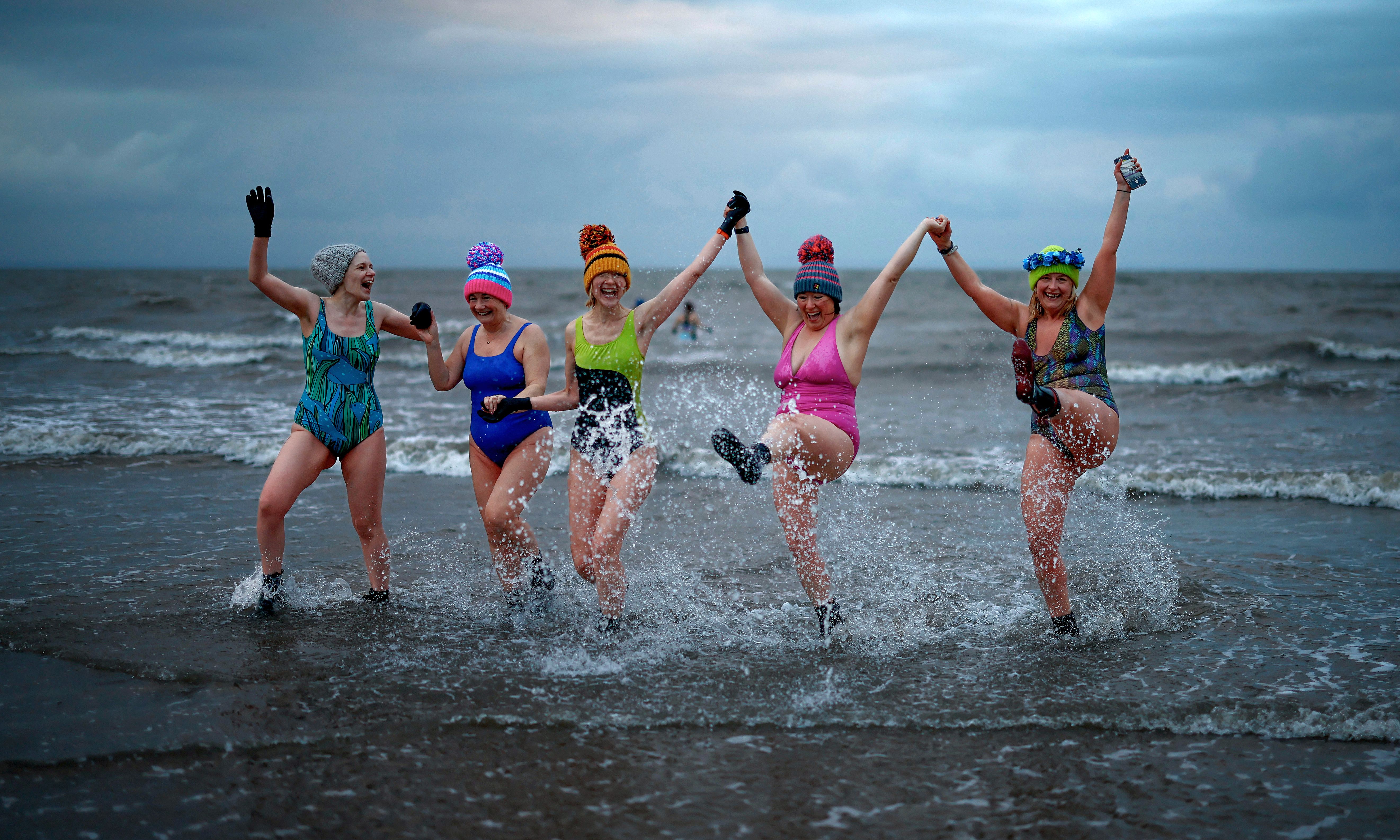 Swimmers take part in a sunrise dip in the North Sea at Portobello Beach, to mark International Women’s Day on March 08, 2024 in Edinburgh, Scotland. The event was conceived to promote the cause of 'Inspiring Inclusivity' to value women's inclusion and champion a spirit of collectivity. (Photo by Jeff J. Mitchell/Getty Images)