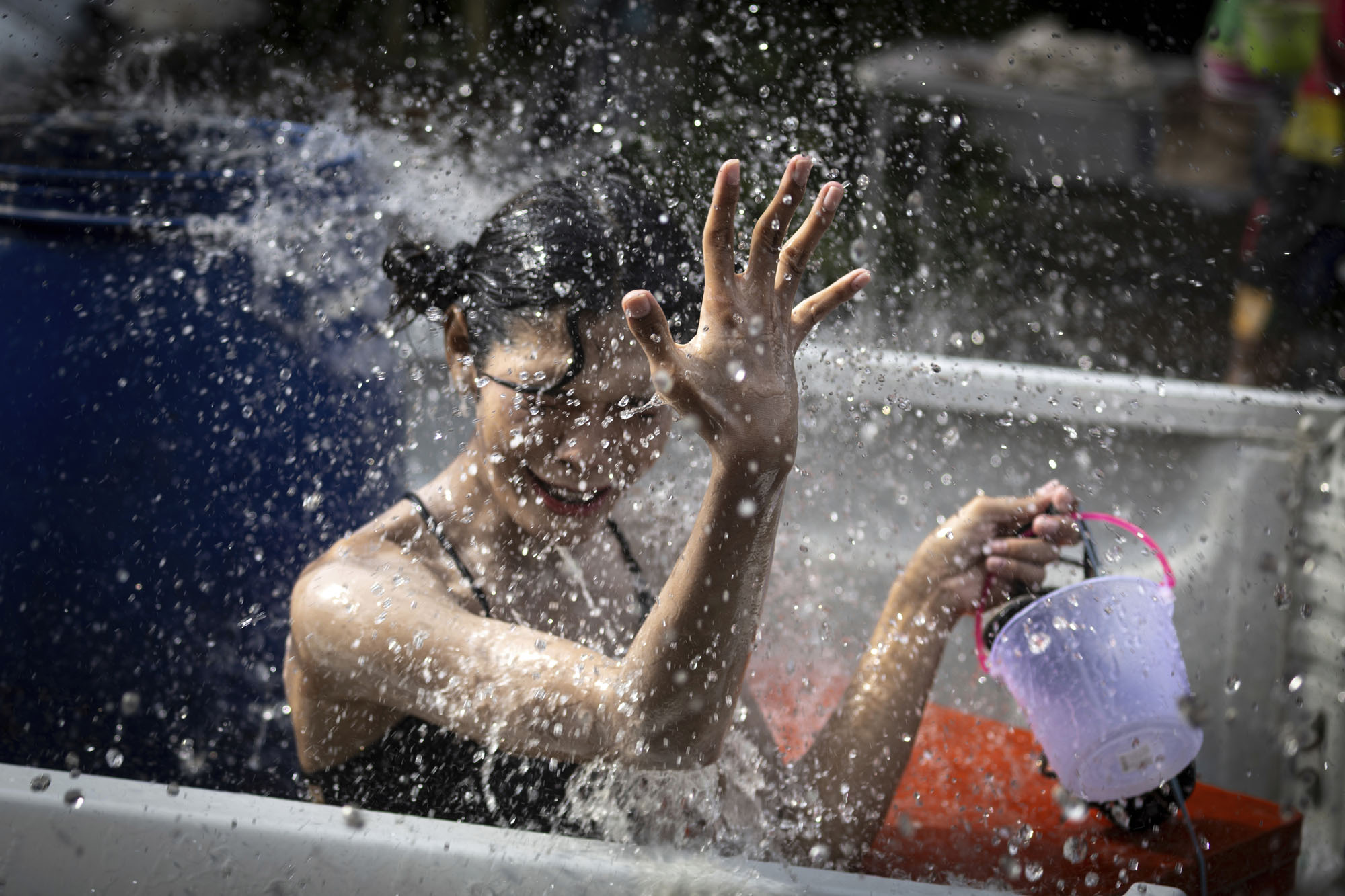 A woman reacts as water is splashed on her during the Songkran water festival to celebrate the Thai New Year in Prachinburi Province, Sunday, April 13, 2025. (Photo by Wason Wanichakorn/AP Photo)