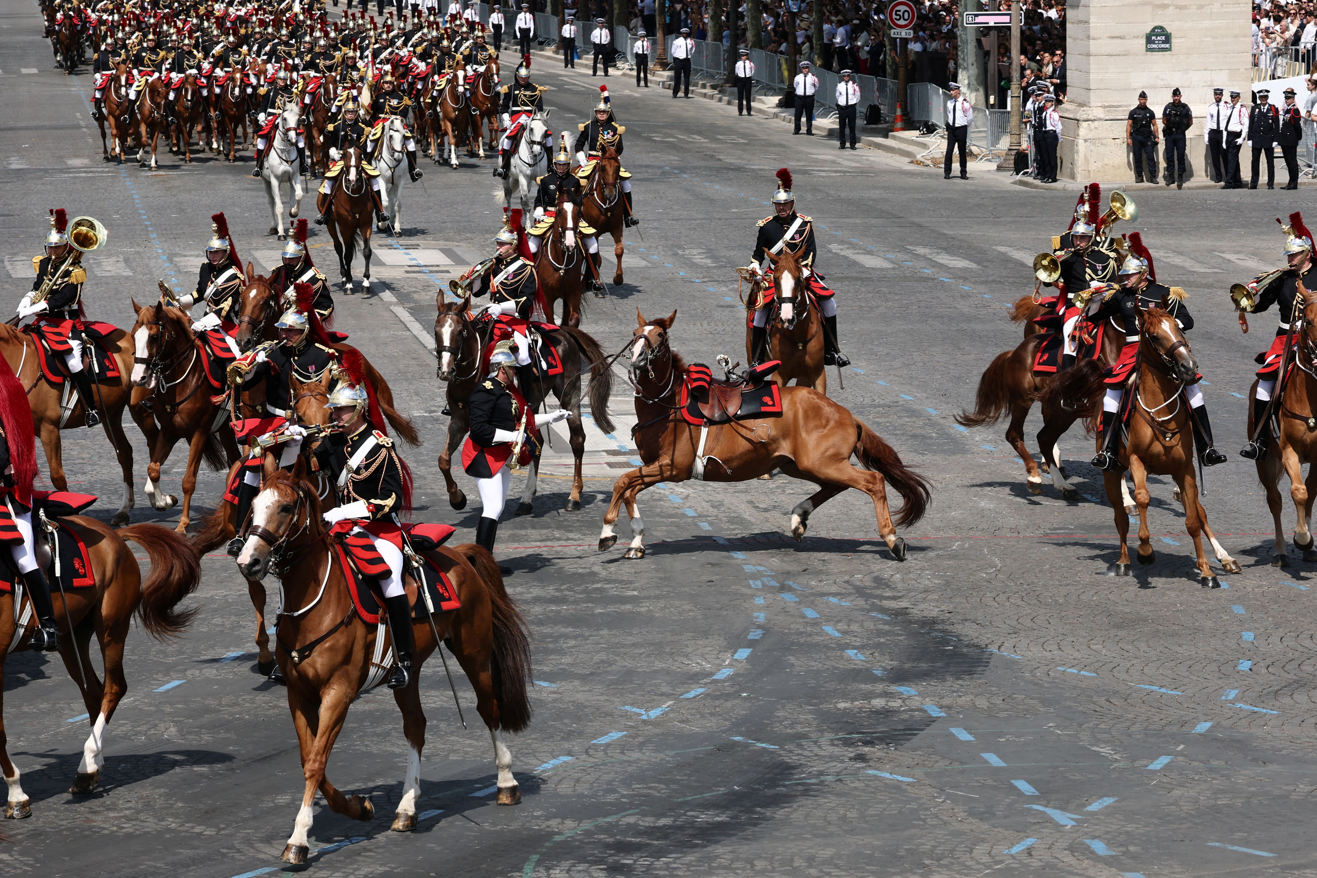 A French Republican Guard helps his horse after a fall during the annual Bastille Day military ceremony on the Champs-Elysees avenue in Paris, France, on July 14, 2025. (Photo by Gonzalo Fuentes/Reuters)