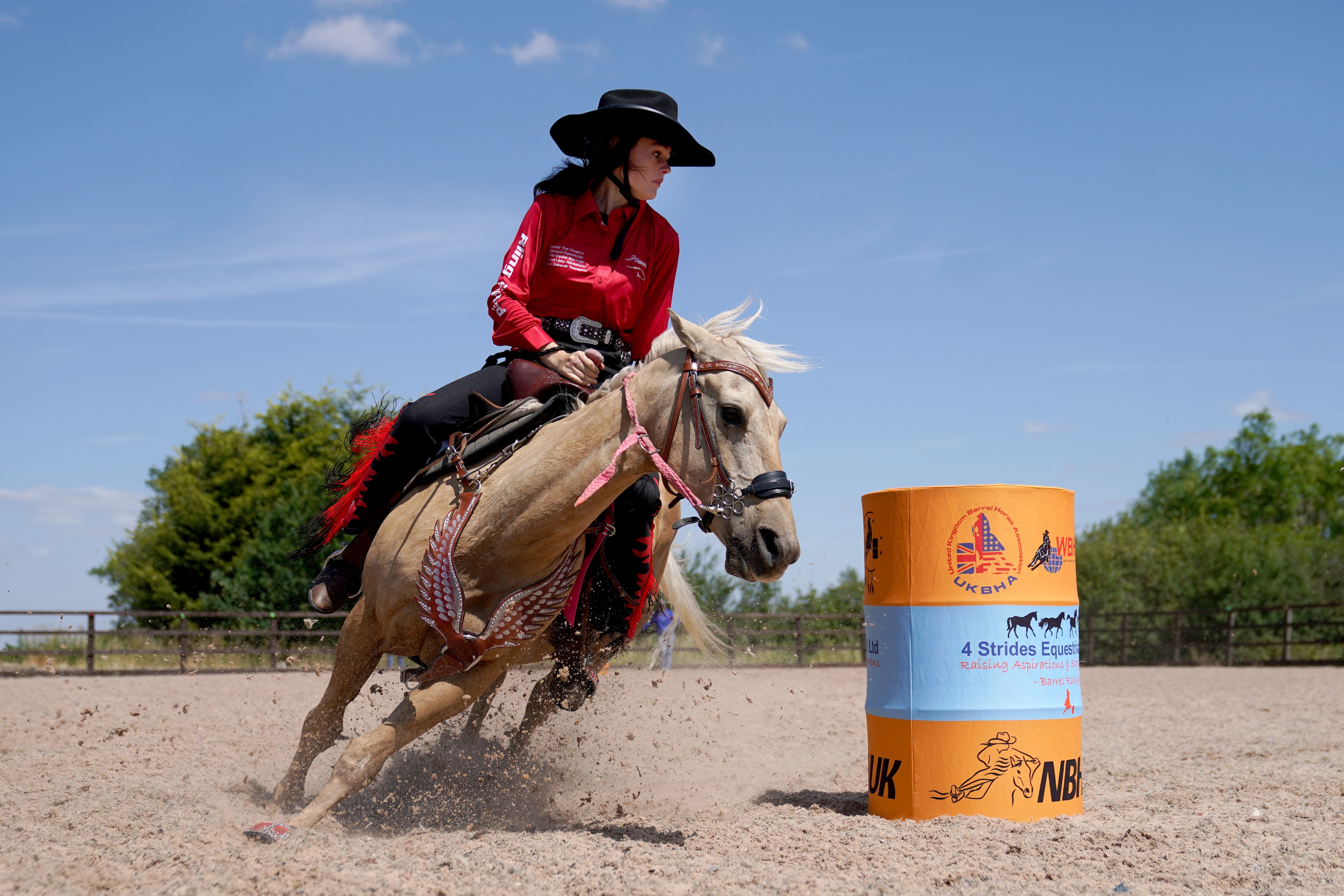 Barrel racer Eloisa Atkinson, 15, on her pony Peaches during a training session at 4 Strides Equestrian UK in Fulbeck, Lincolnshire on Tuesday, July 8, 2025. Eloisa, from Mirfield in West Yorkshire is due to compete at the National Barrel Horse Association Teen and Youth World Championships in Georgia, USA next week. (Photo by Joe Giddens/PA Wire)