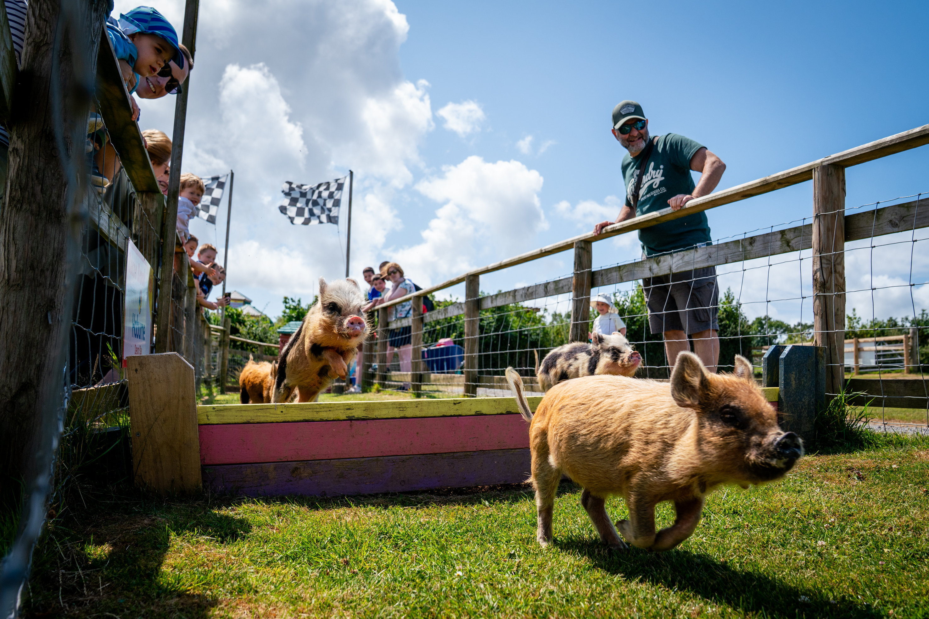 Pennywell miniatures take part in daily miniature pig race as part of the pig enrichmant program at Pennywell Farm, Devon in UK on July 14, 2025. (Photo by South West News Service)