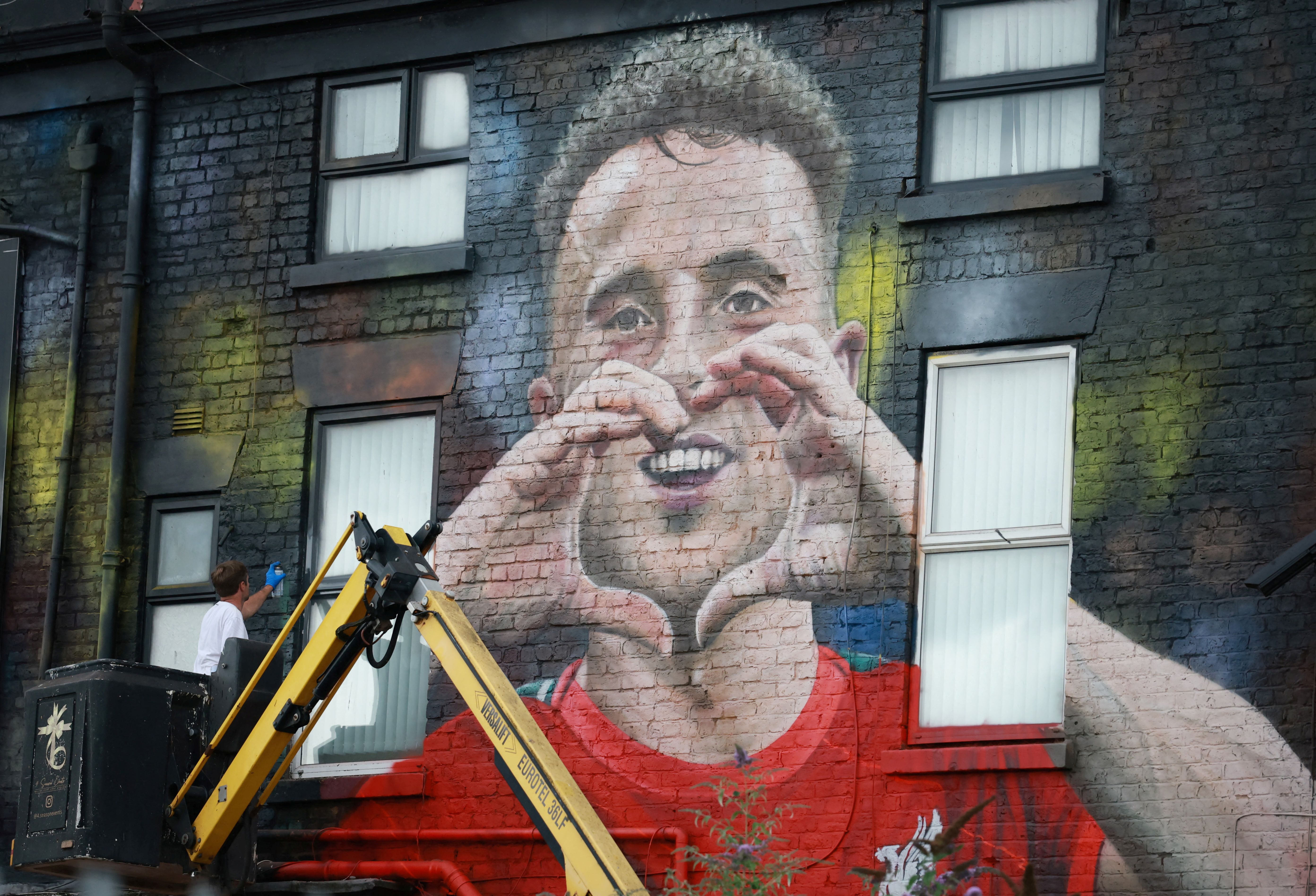 Artist John Culshaw works on a mural of late Liverpool player Diogo Jota on the side of a pub in Liverpool, Britain, on July 14, 2025. (Photo by Phil Noble/Reuters)
