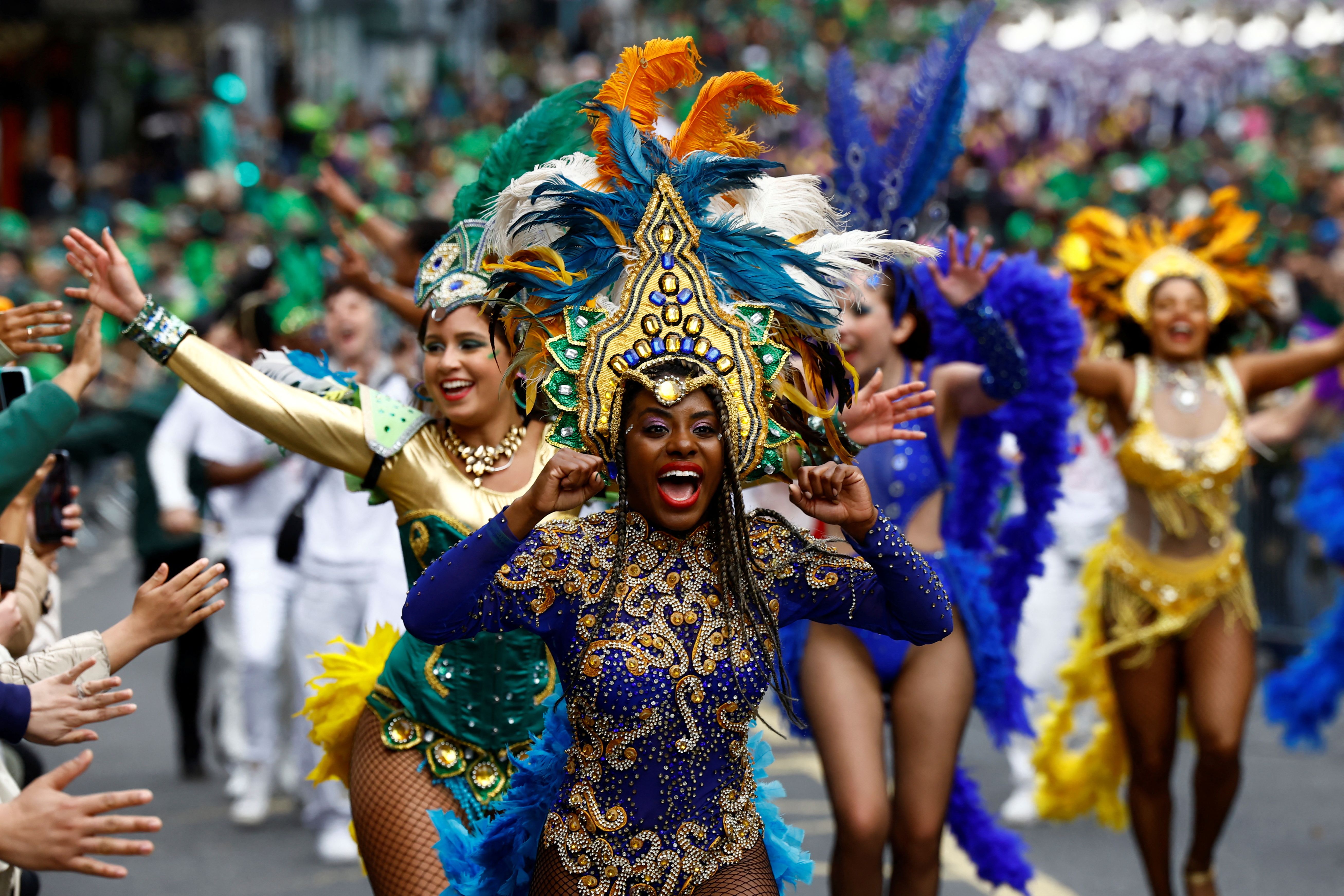 Revelers walk in the St. Patrick's Day parade in Dublin, Ireland on March 17, 2024. (Photo by Clodagh Kilcoyne/Reuters)