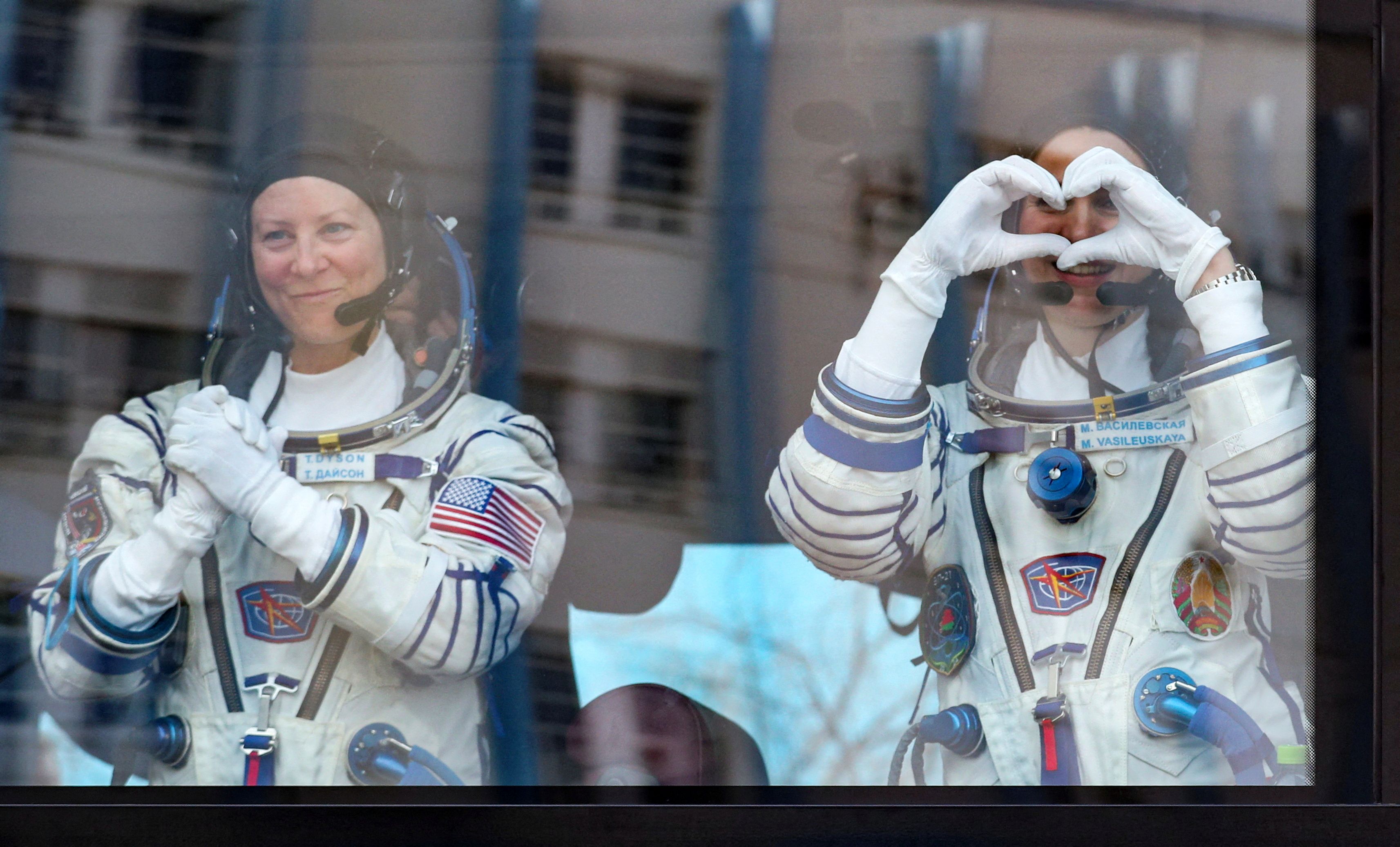 NASA astronaut Tracy Dyson and Spaceflight participant Marina Vasilevskaya of Belarus react during their space suit check shortly before launch to the International Space Station (ISS) at the Baikonur Cosmodrome, Kazakhstan, March 21, 2024. (Photo by Pavel Mikheyev/Reuters)