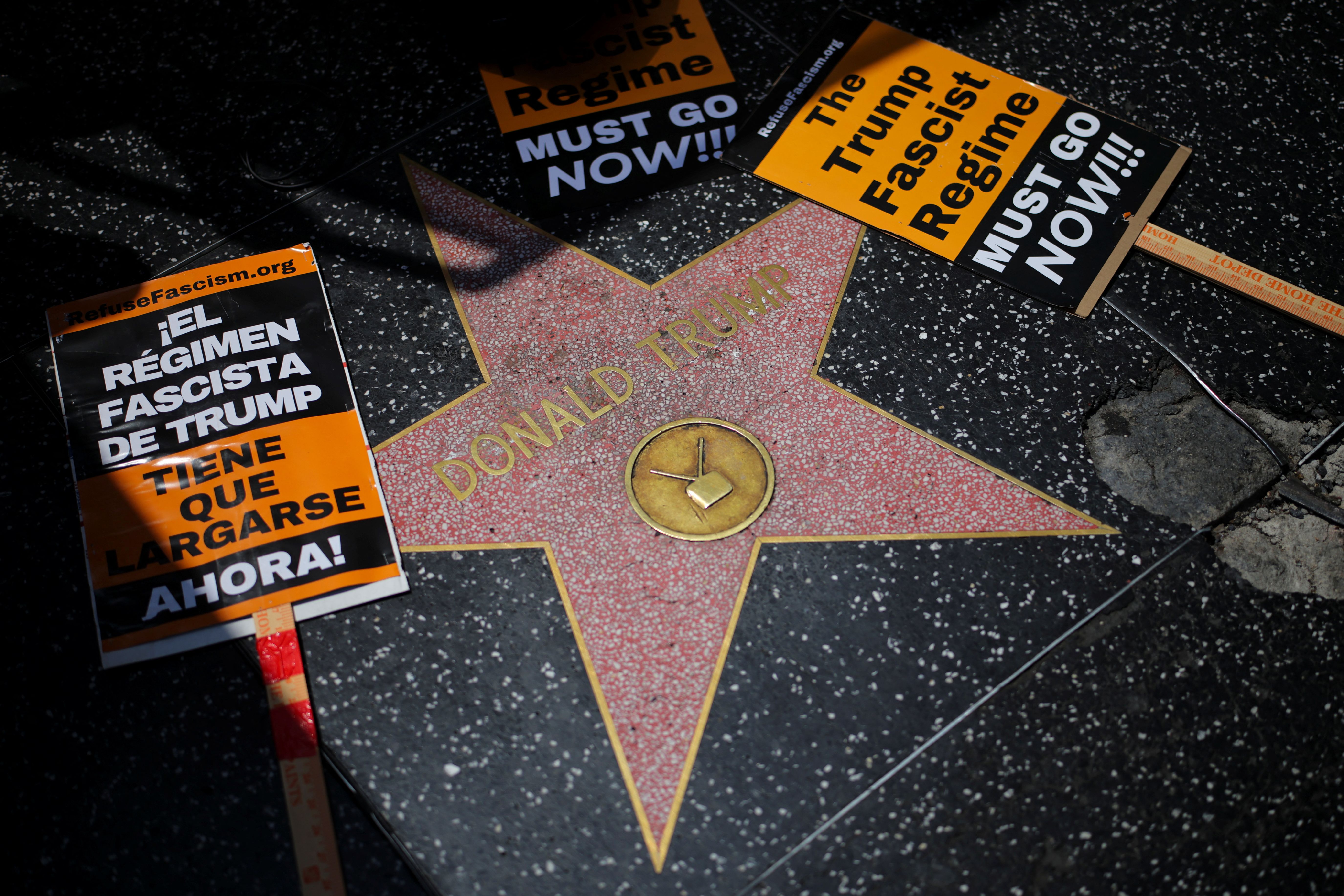 Protest signs are placed next to U.S. President Donald Trump's star on the Hollywood Walk of Fame to denounce him for threatening to strip U.S. comedian Rosie O'Donnell of her citizenship, in Los Angeles, California, U.S., July 14, 2025. (Photo by Daniel Cole/Reuters)