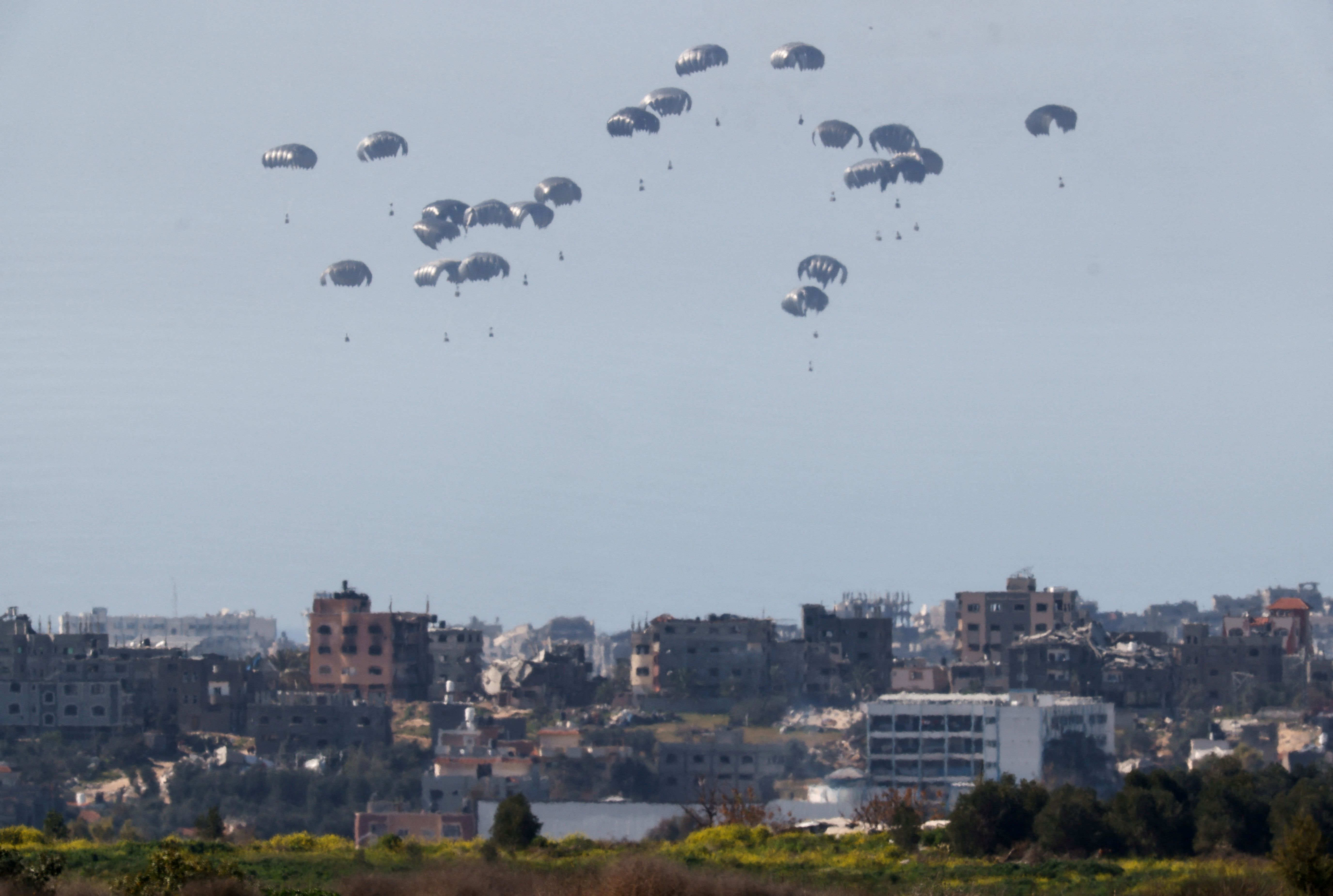 Packages fall towards Gaza, after being dropped from a military aircraft, as seen from Israel's border with Gaza in southern Israel on March 5, 2024. (Photo by Amir Cohen/Reuters)