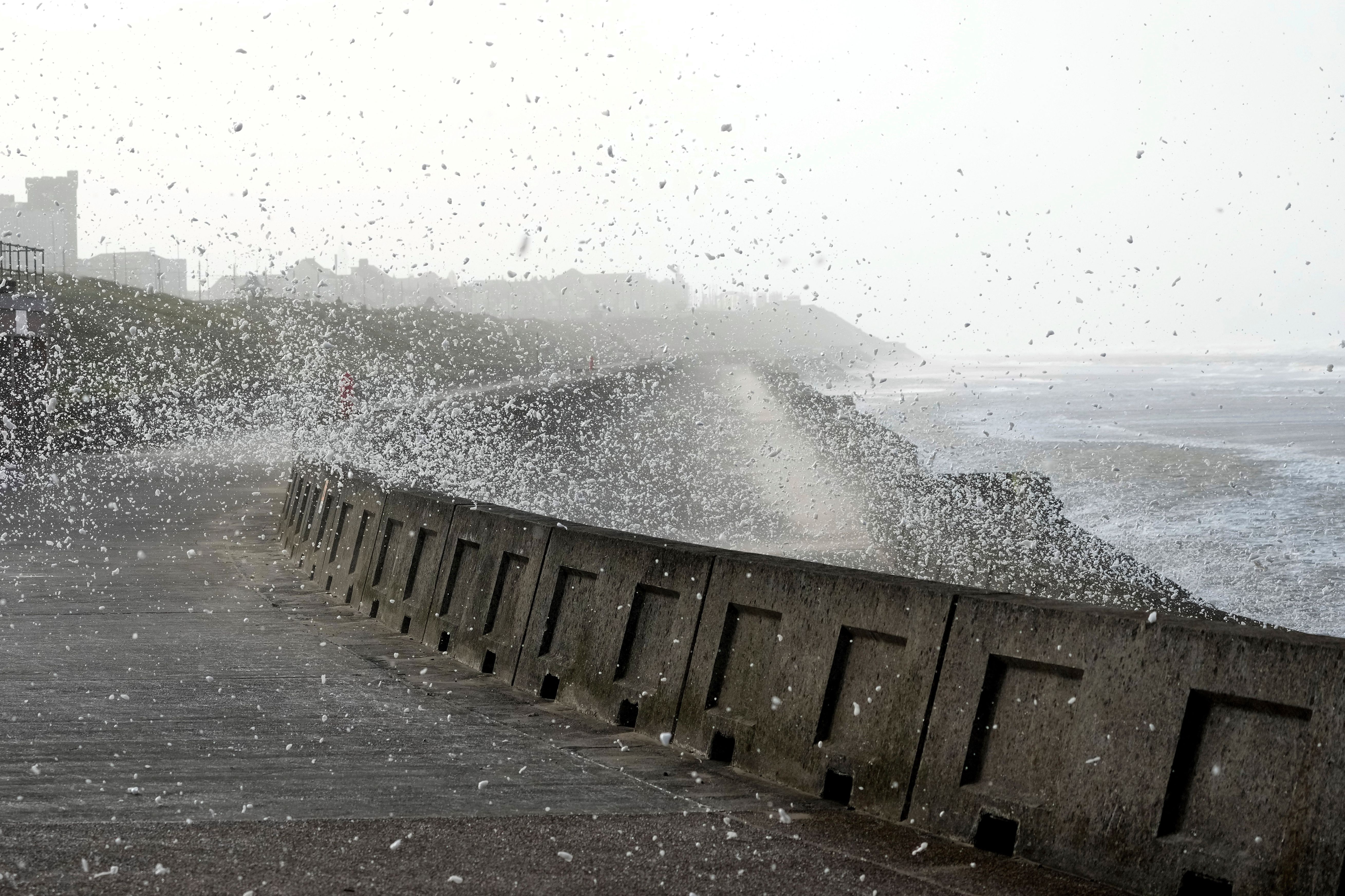 Waves crash on the Seawall during Storm Eowyn that hits the country in Cleveleys, near Blackpool, England, Friday, January 24, 2025.(Photo by Jon Super/AP Photo)