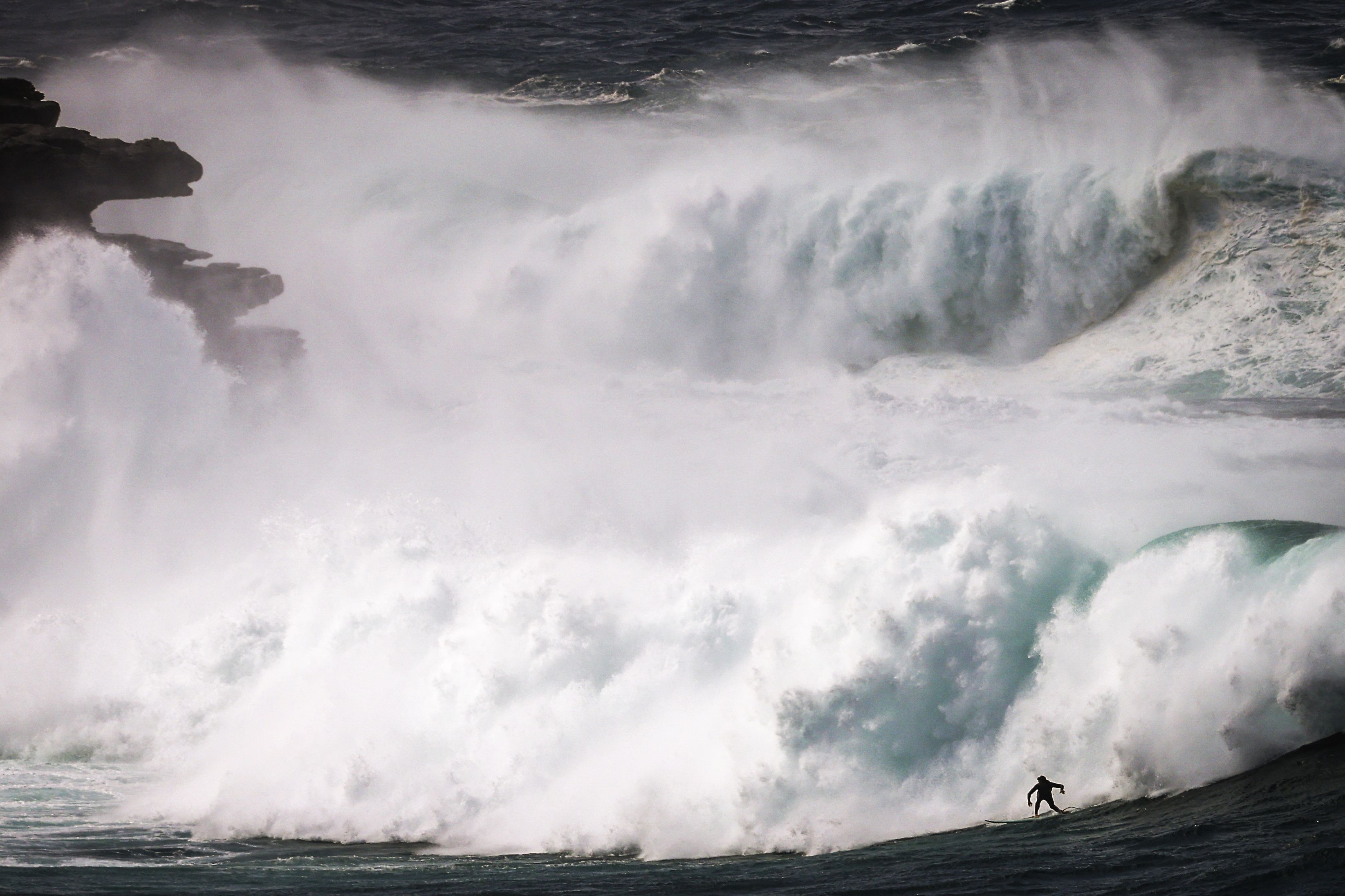 A surfer rides a large wave at Bondi Beach in Sydney on April 1, 2025, as large swells and high winds hit the east coast of Australia. (Photo by David Gray/AFP Photo)