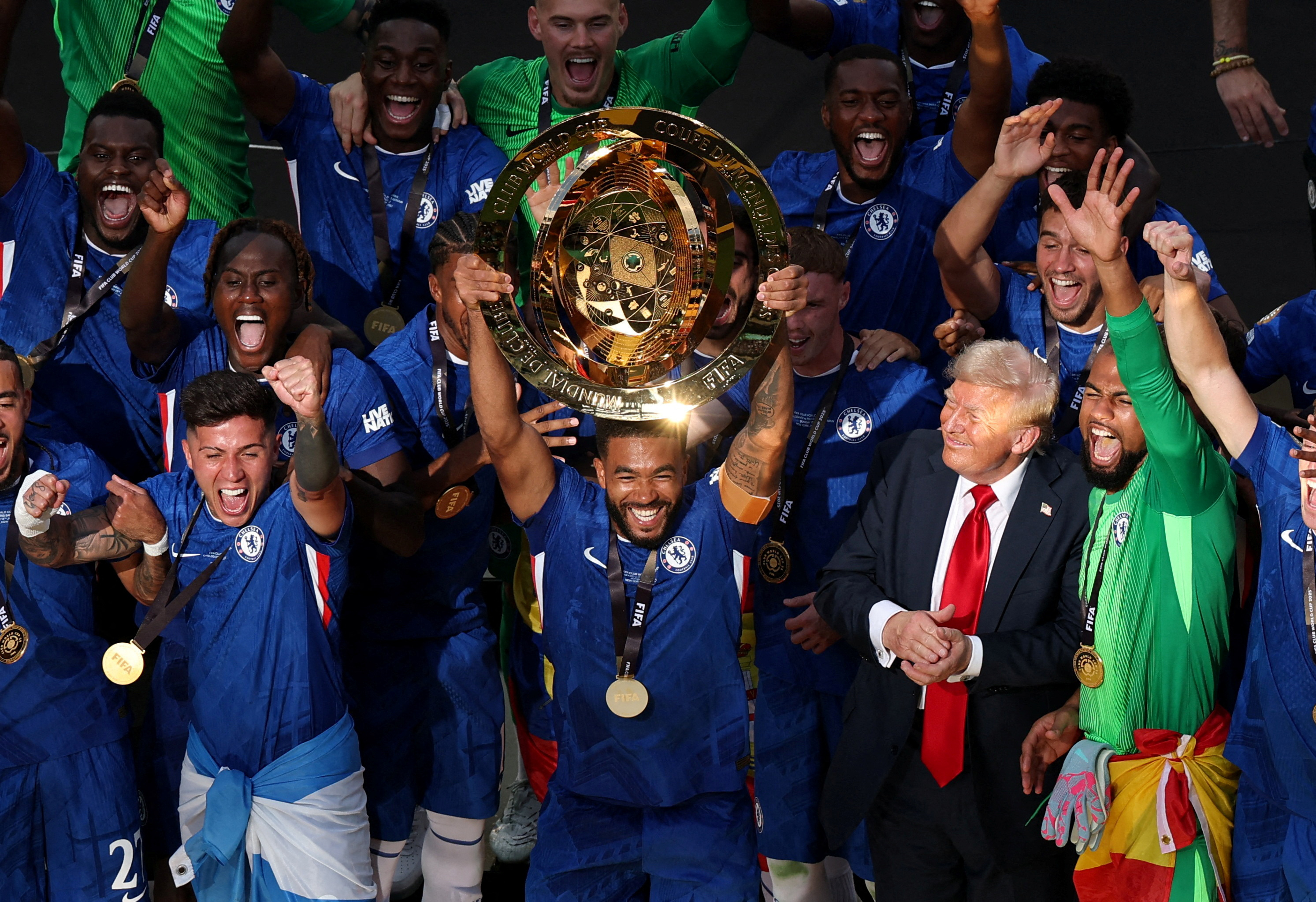 Chelsea's Reece James lifts the trophy as he celebrates with teammates after winning the FIFA Club World Cup as U.S. President Donald Trump looks on at MetLife Stadium on July 13, 2025. (Photo by Amanda Perobelli/Reuters)