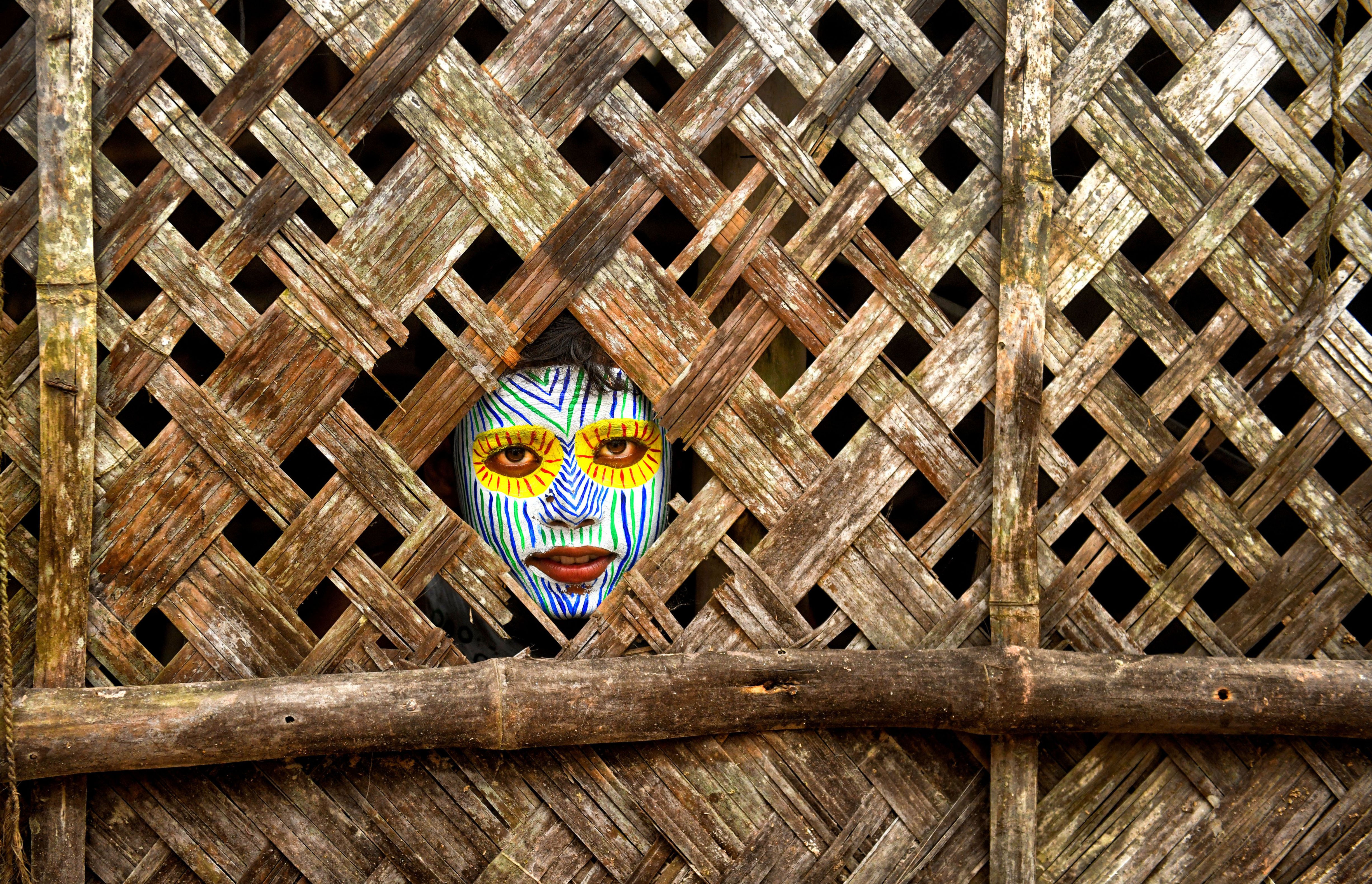 A child poses with face painting during the event in Canning, West Bengal on June 15, 2025. For generations Bahurupi artists from West Bengal have been practicing in the art of face painting. Using their painting techniques they can easily metamorphose into different characters during a performance, which often represents tribal myths. These traditional artists scrape a living from their performances, relying on the generosity of audiences for their income. (Photo by Avishek Das/SOPA Images/LightRocket via Getty Images)