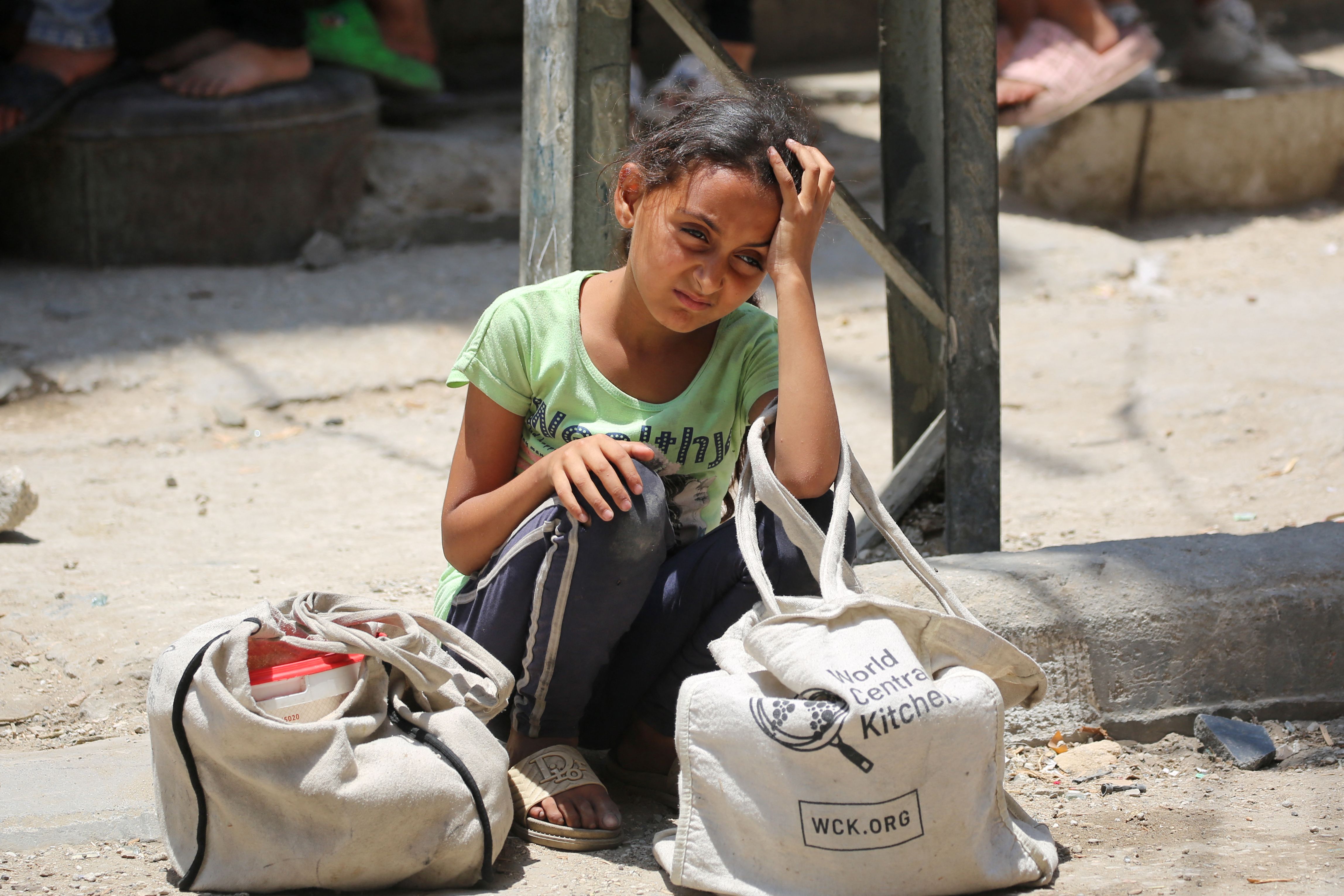 A Palestinian girl waits next to a queue at a food distribution point in Nuseirat, in the central Gaza Strip, on June 23, 2025. The Israeli blockade imposed in early March amid an impasse in truce negotiations had produced famine-like conditions across Gaza, according to rights groups. (Photo by Eyad Baba/AFP Photo)