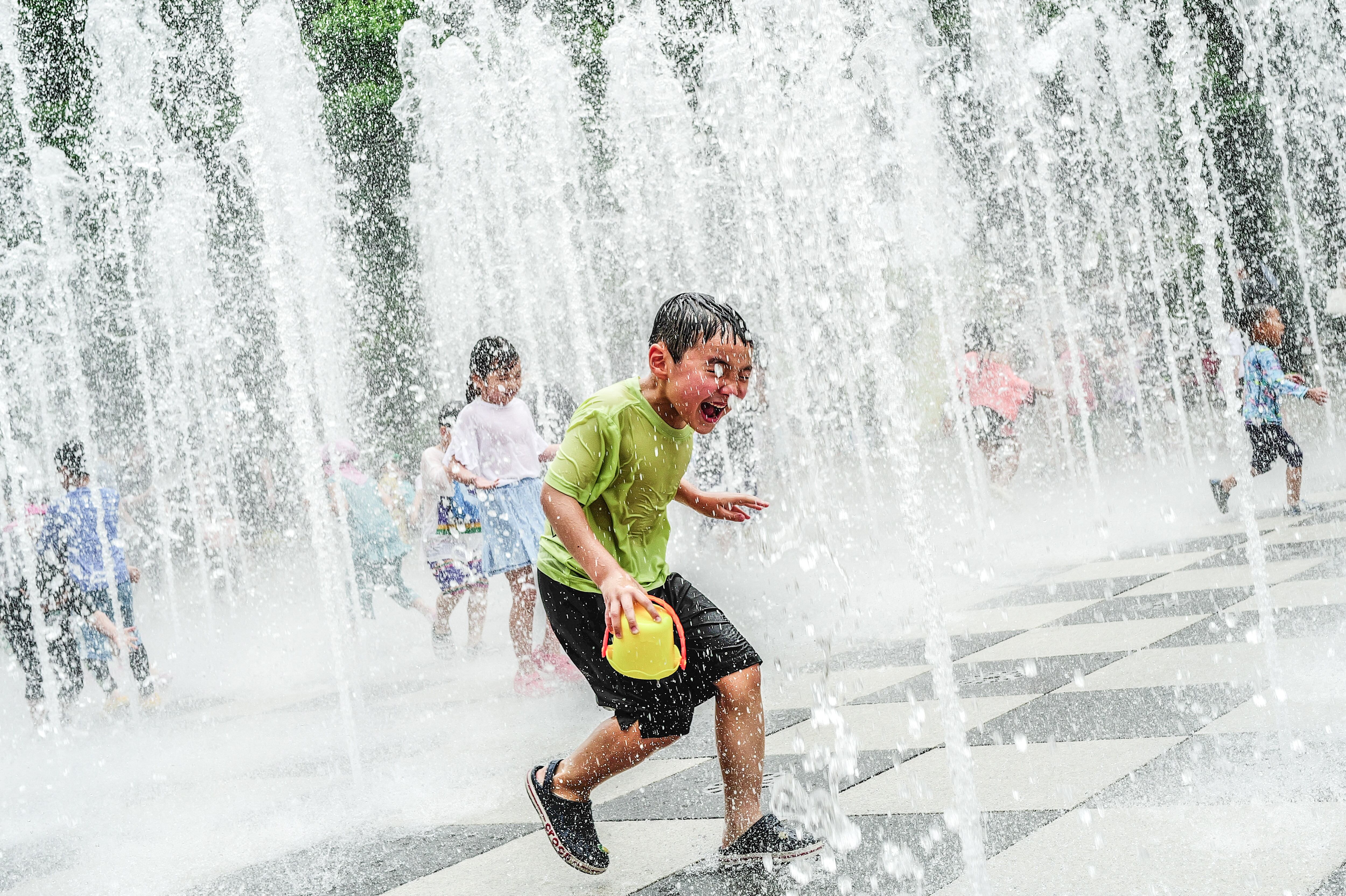 Children cool off in the water from the fountain at Seoul Forest in Seongdong-gu, Seoul on June 4, 2023. (Photo by Koh Woon-ho)