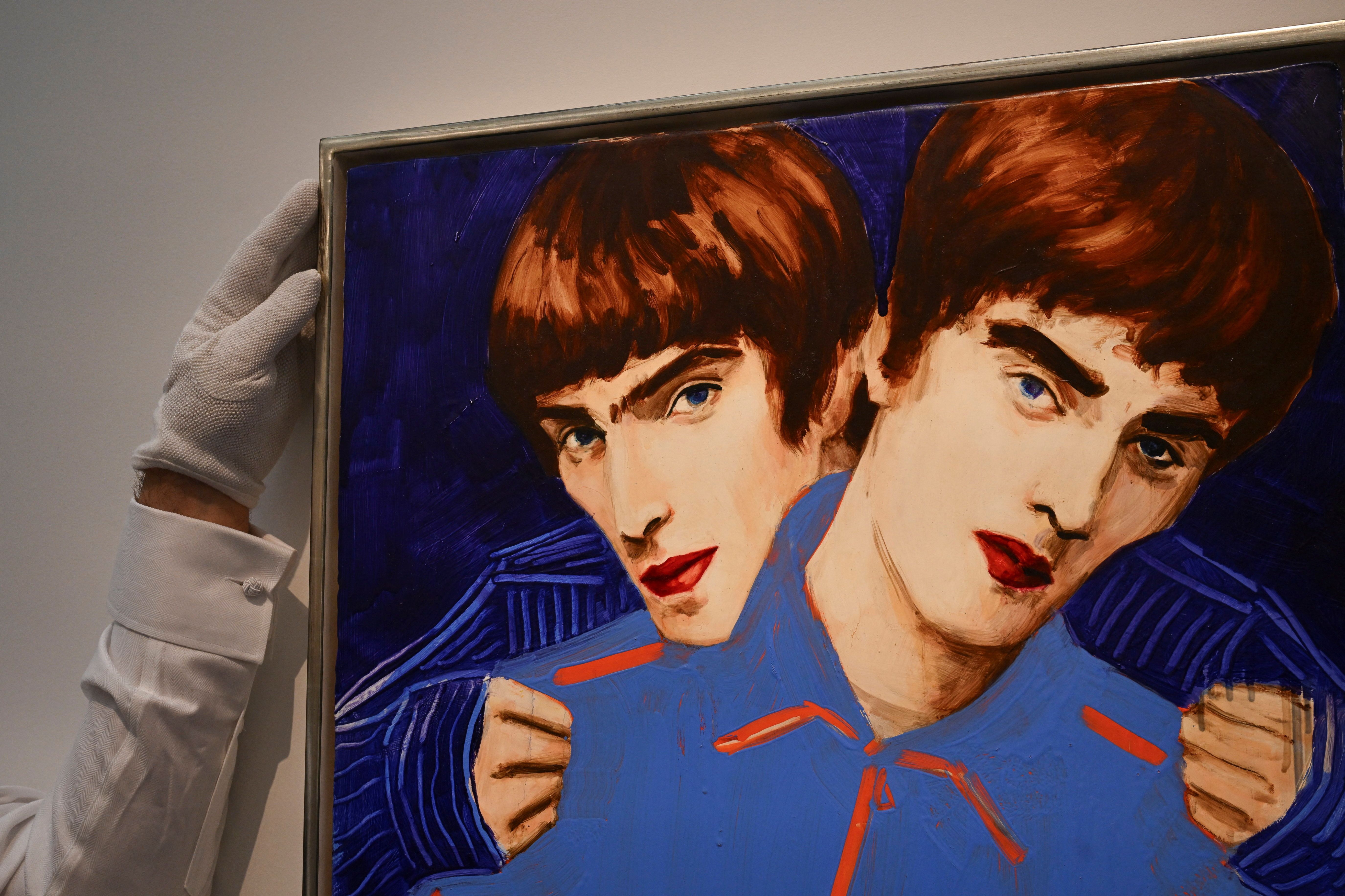 An art handler poses with “Liam & Noel” (1996) by American painter Elizabeth Peyton during the press preview of the upcoming Modern & Contemporary Evening Auction at Sotheby’s Auctions in London, Britain, on June 18, 2025. (Photo by Jaimi Joy/Reuters)