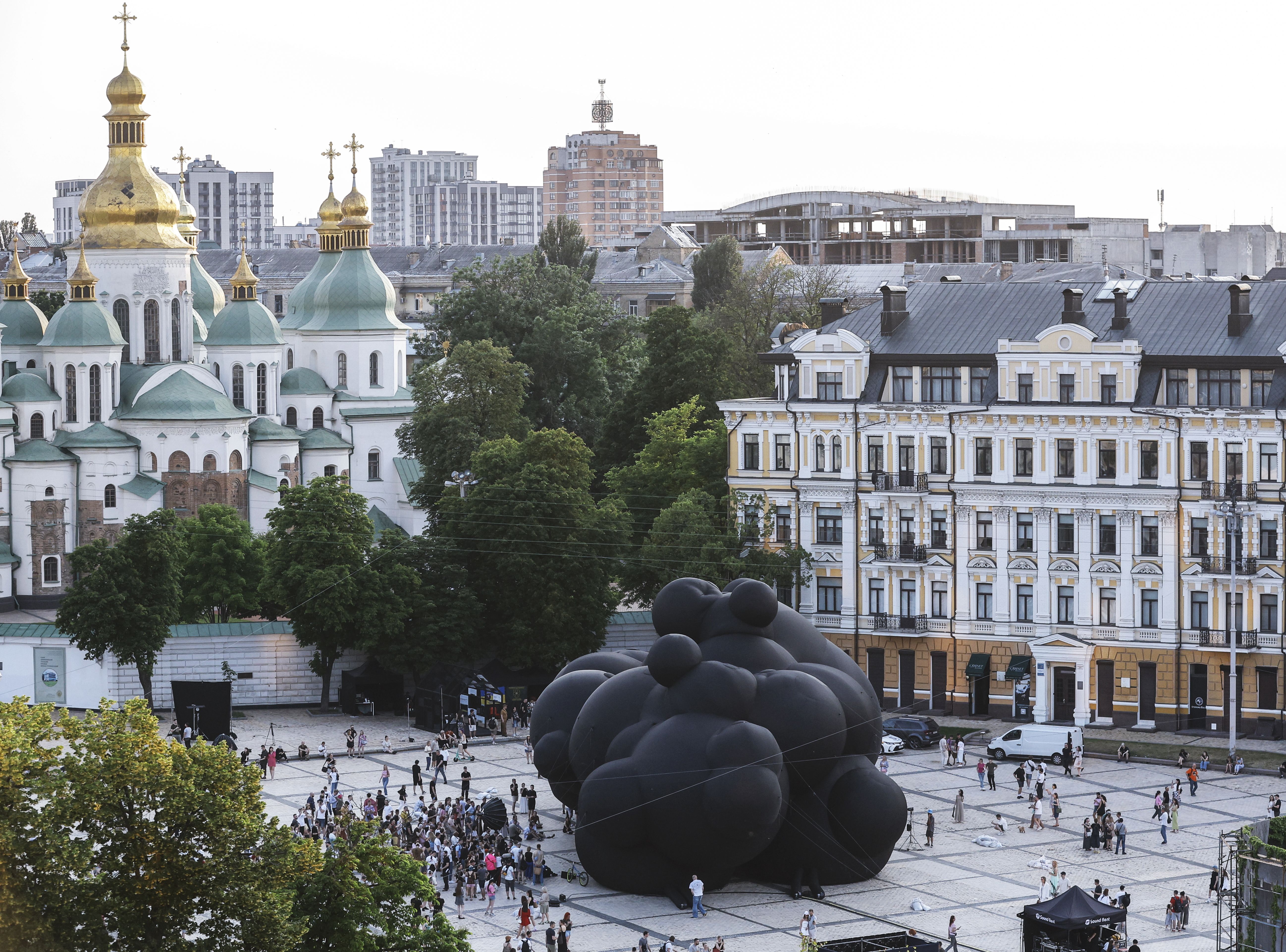 A general view of the “Black Cloud” artwork in downtown Kyiv, Ukraine, 07 June 2025. The 'Black Cloud' of modern Ukrainian artist Oleksiy Sai, a 30-meter-long artwork, will be shown for two days at Saint Sophia Square before heading to the 2025 Burning Man Festival in the United States. The piece represents an unavoidable threat, a looming storm, symbolizing the war in Ukraine. Project producer Vitaliy Deynega says it is time for Europe and the United States to stop ignoring it and prepare to help Ukraine. (Phoot by Sergey Dolzhenko/EPA)
