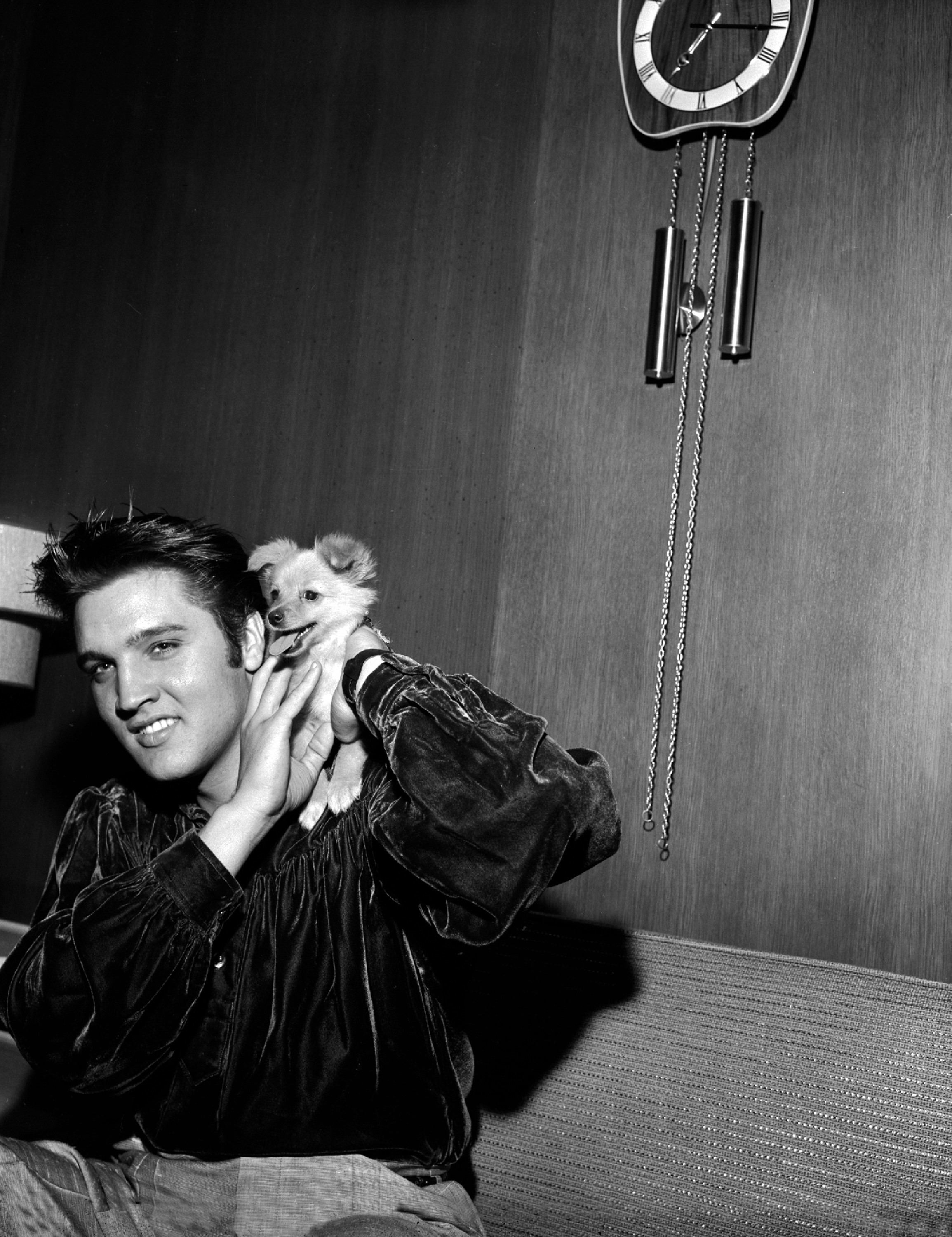 Rock and roll star Elvis Presley plays with his puppy Sweet Pea after a brief fistfight the evening of October 18, 1956 with two filling station attendants, one of whom received a black eye. Presley said one of the men slapped him as he was signing autographs. All were scheduled to appear in court the following day. (Photo by Gene Herrick/AP Photo)