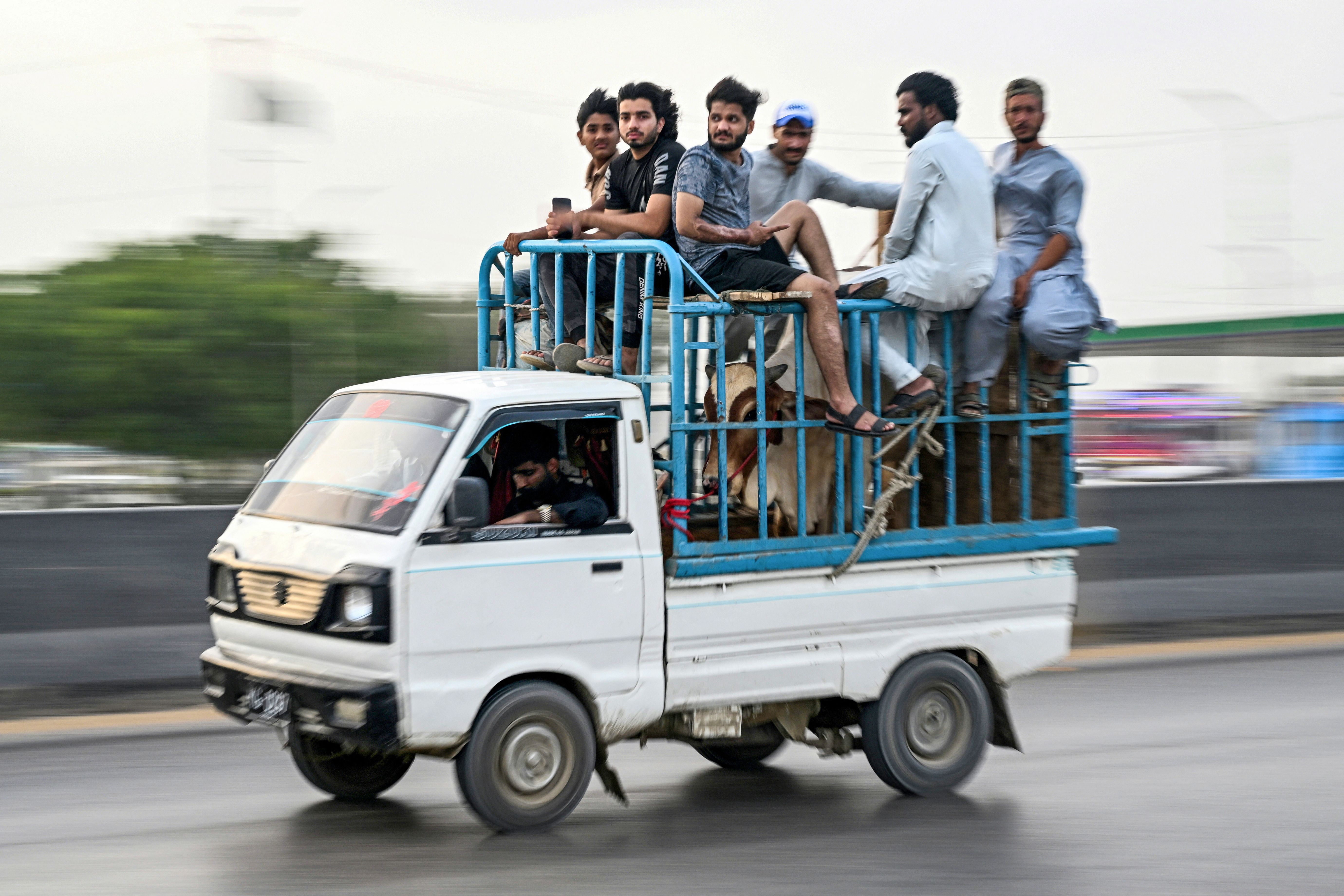People ferry cattle on a vehicle ahead of the Muslim festival of Eid al-Adha in Karachi on June 3, 2025. (Photo by Rizwan Tabassum/AFP Photo)