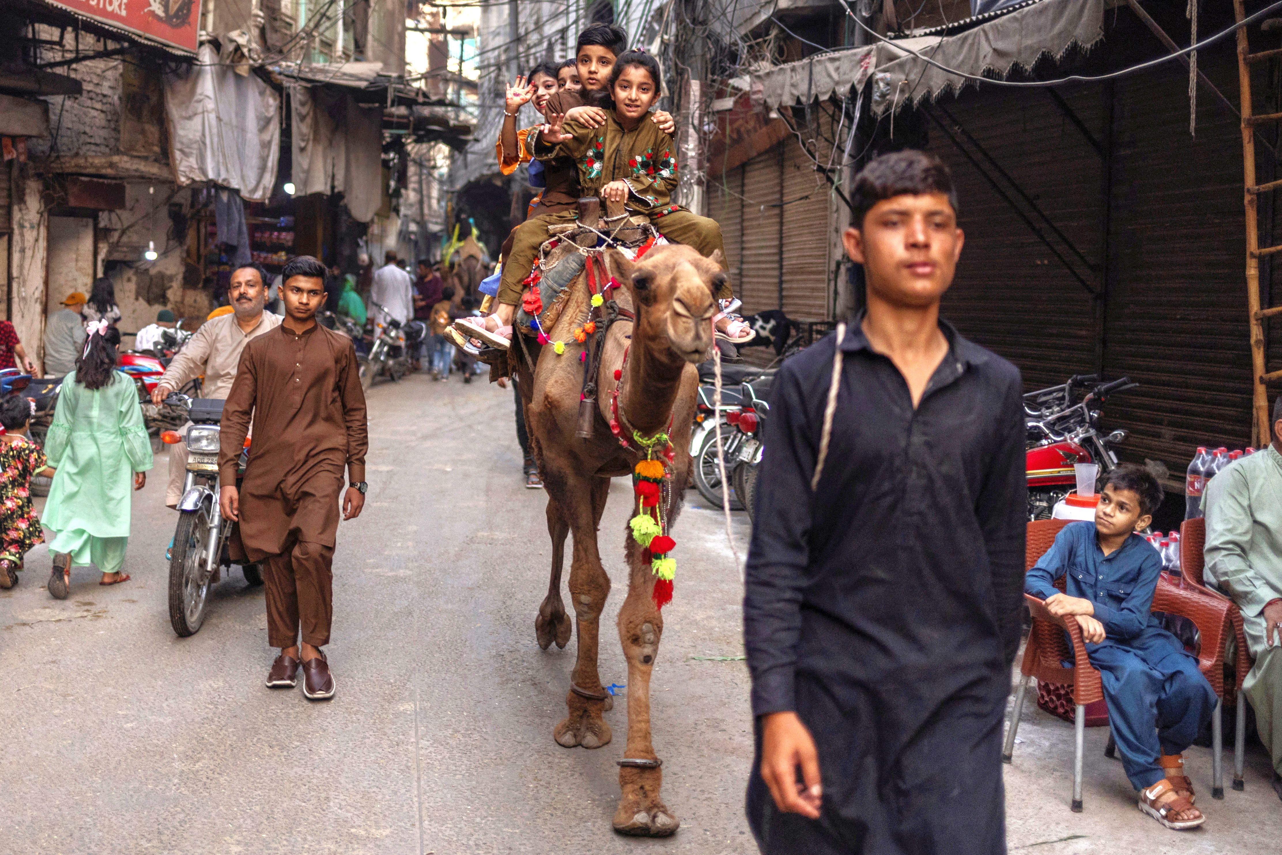 Siblings celebrate Eid al-Adha with a camel ride through the bustling streets of the Walled City of Lahore, Pakistan, on June 7, 2025. (Photo by Adrees Latif/Reuters)