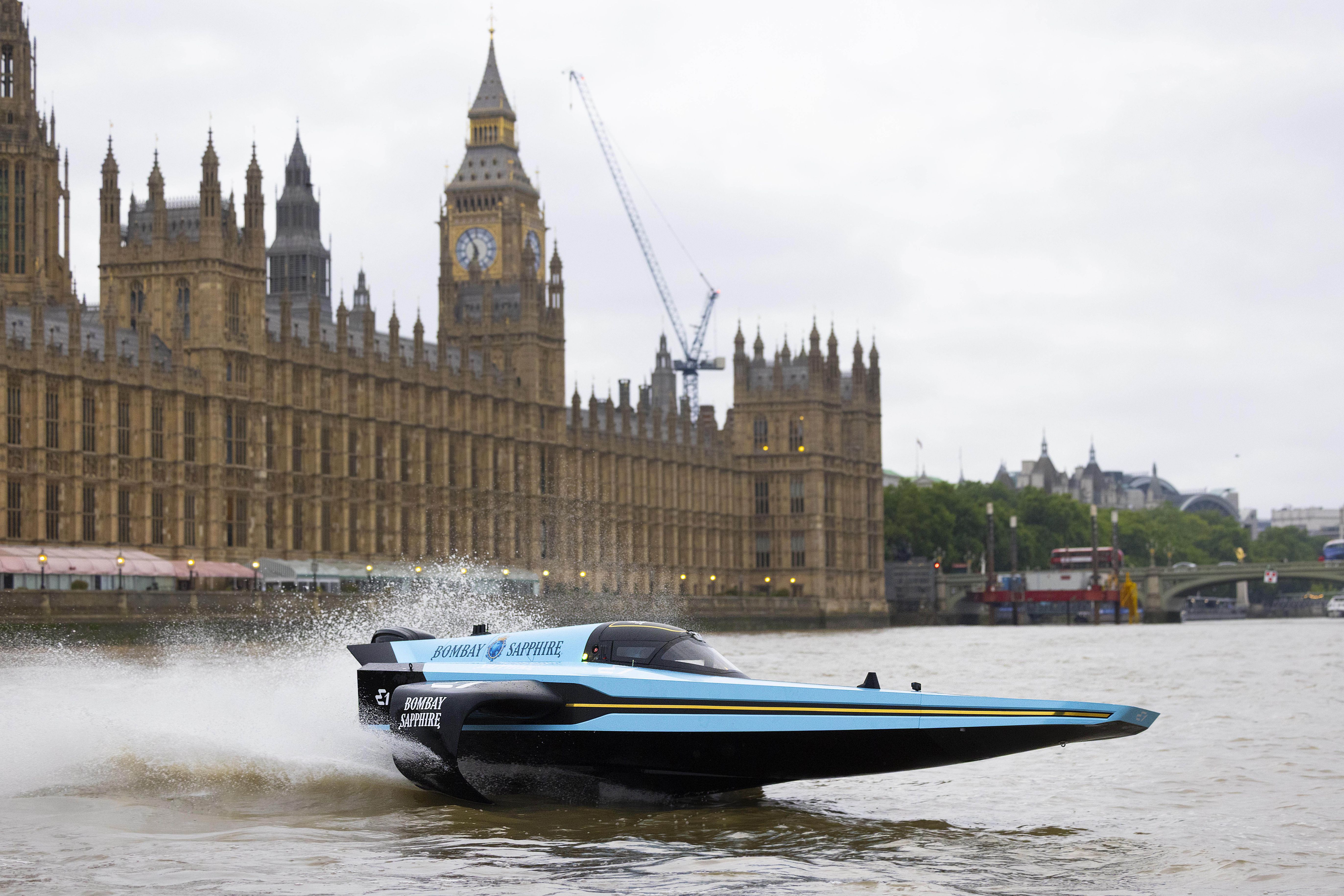 General view of an E1 RaceBird all-electric race boat, as it makes its UK debut at the E1 London Showrun presented by Bombay Sapphire, official global partner of the UIM E1 World Championship, on the River Thames in London on Wednesday, July 2, 2025. (Photo by David Parry/PA Media Assignments)