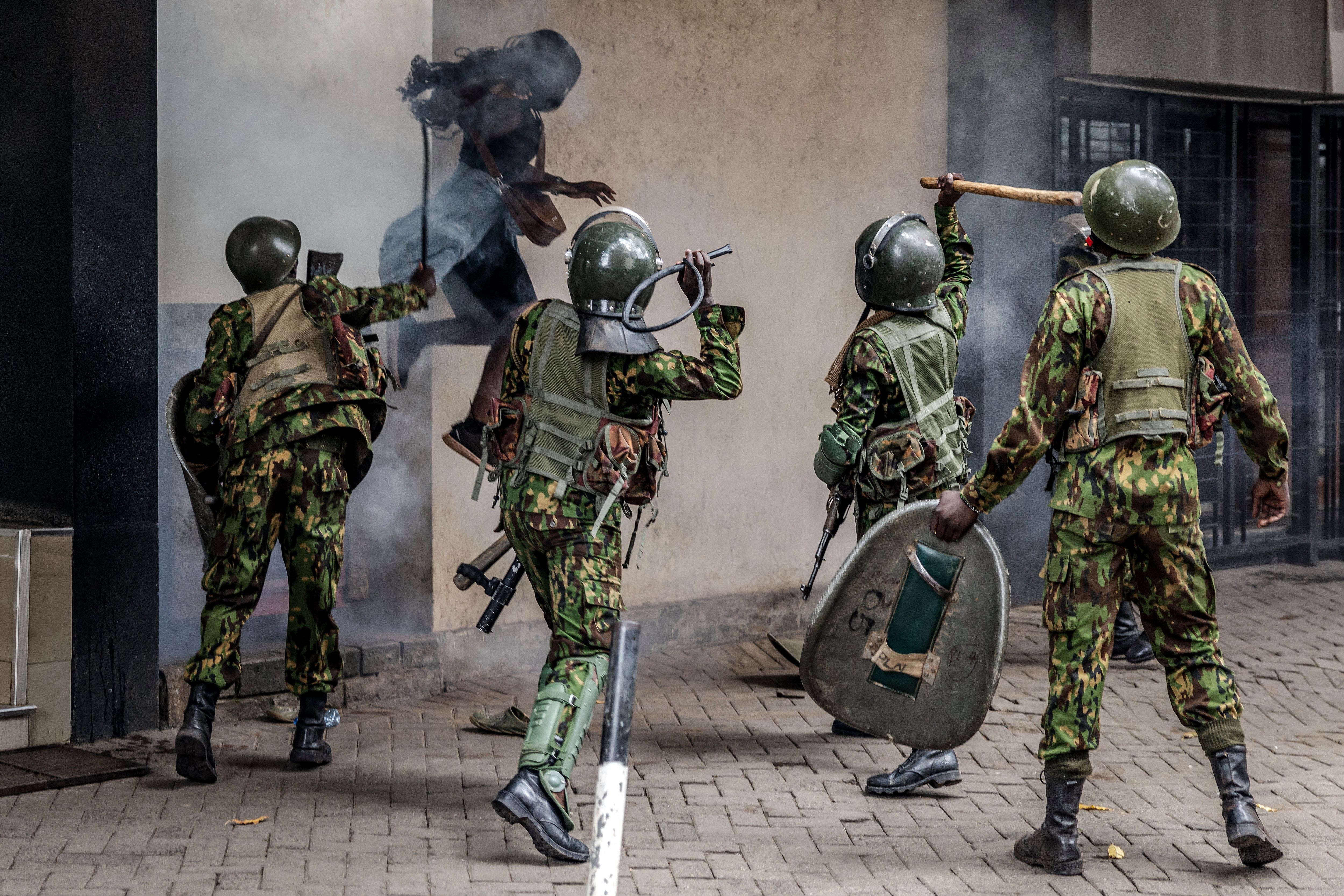 A protester jumps for safety as she emerges from a narrow alley while Kenyan police officers strike her with whips and clubs during a planned protest marking the first anniversary of the storming of the parliament in Nairobi, Kenya on June 17, 2025. At least 16 people were killed and 400 injured as a nationwide demonstration to honour those killed during last year’s anti-government protests turned chaotic, with police clashing with protesters in different parts of the country. (Photo by Luis Tato/AFP Photo)