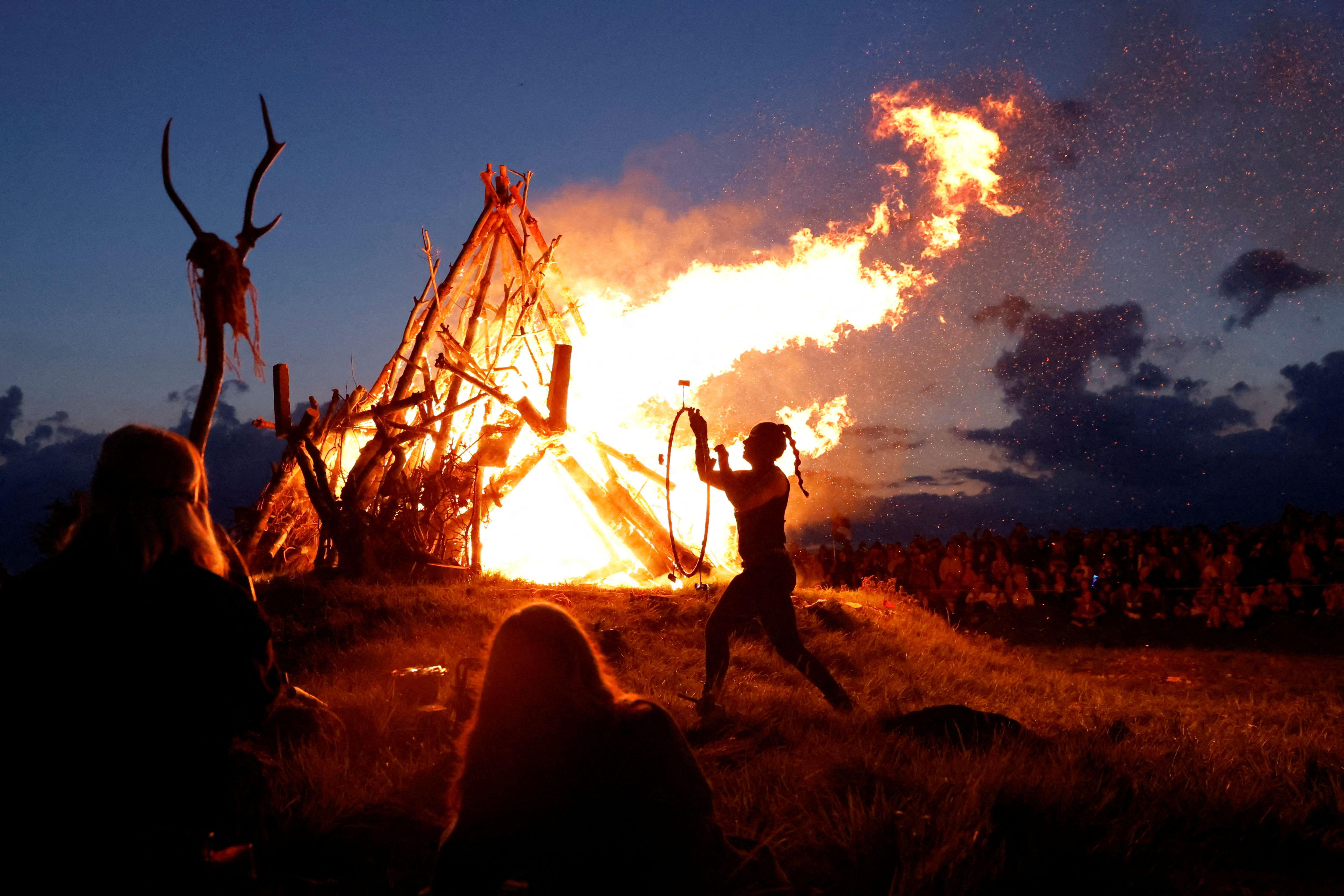 A fire dancer performs in front of the bonfire at the Bealtaine fire festival, marking the beginning of summer at the Hill of Uisneach in Rathnew, Ireland, on May 10, 2025. (Photo by Clodagh Kilcoyne/Reuters)