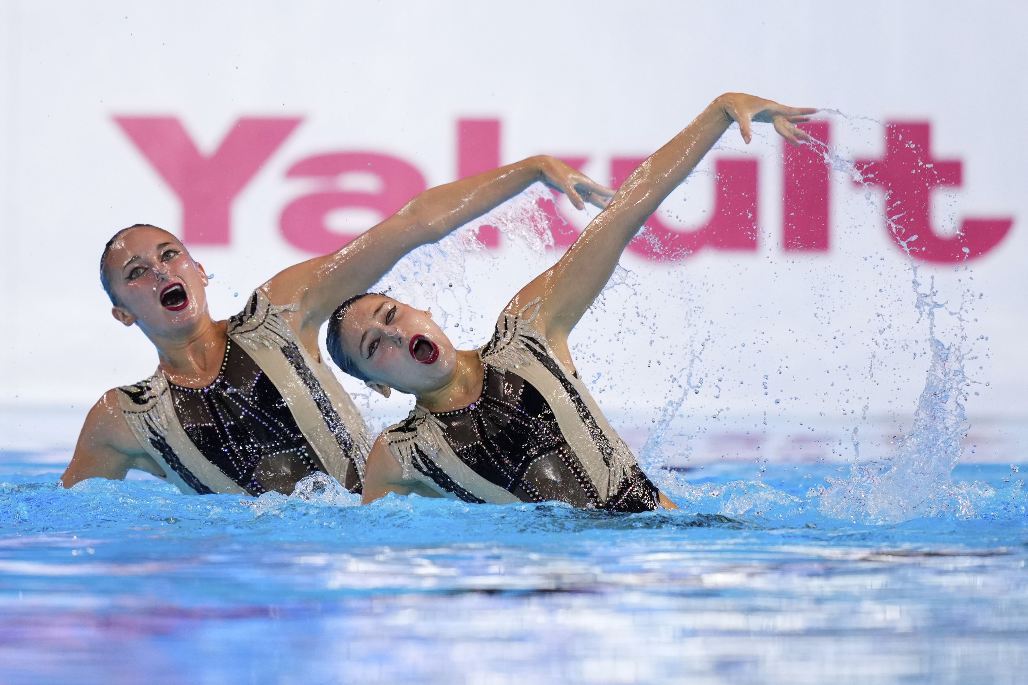Txell Ferre Gaset and Lilou Lluis Valette of Spain compete in the women's duet technical preliminary of artistic swimming at the World Aquatics Championships in Singapore, Friday, July 18, 2025. (Photo by Vincent Thian/AP Photo)
