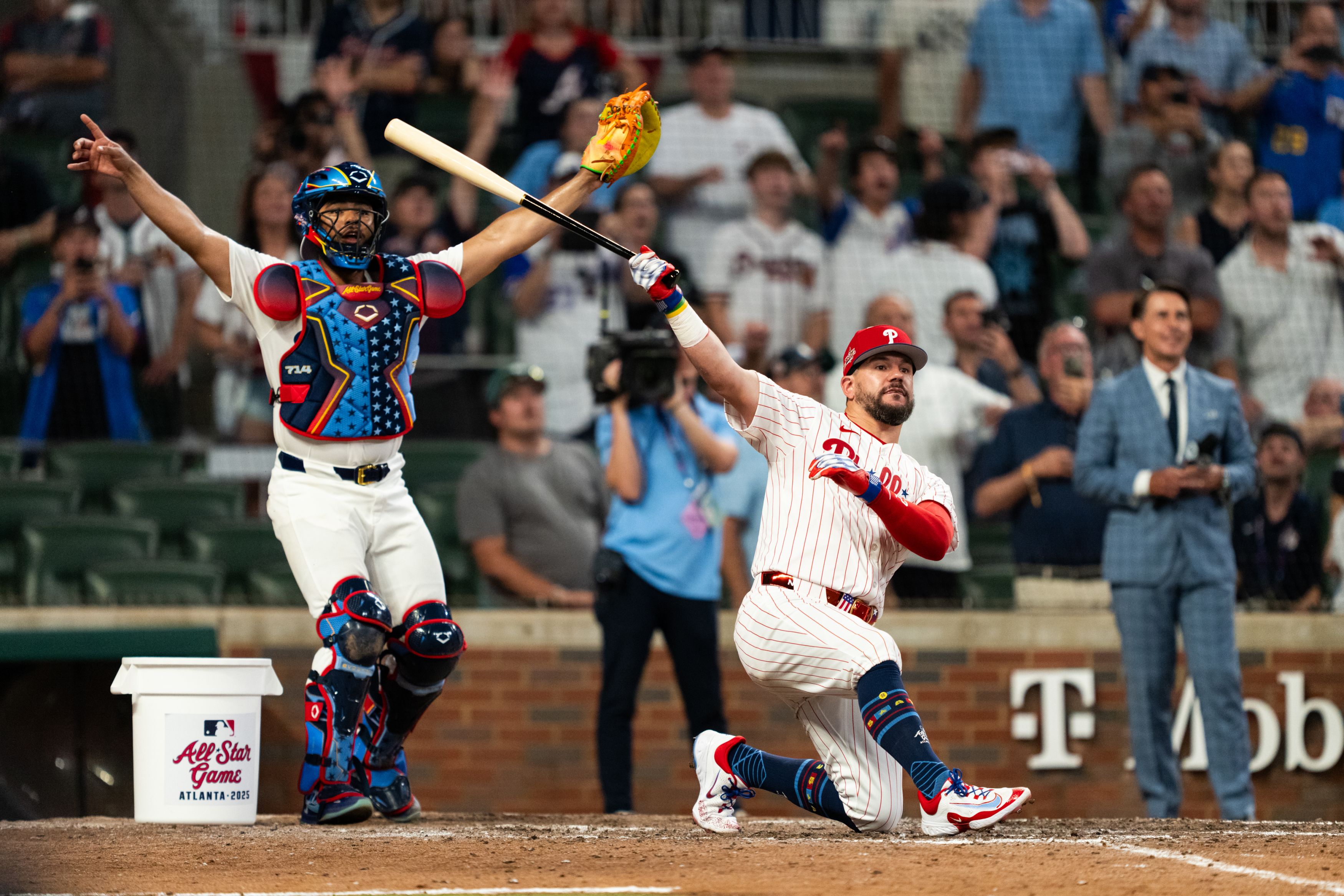 The Philadelphia Phillies’ Kyle Schwarber hits a home run during the historic “swing-off” that decided the Major League Baseball All-Star Game on Tuesday, July 15, 2025. It was the first time ever that the home run derby was used to break a tie after nine innings. Schwarber, who went 3-for-3 in the swing-off, was named the game’s Most Valuable Player as the National League came out victorious. (Photo by Houston Astros/Getty Images)