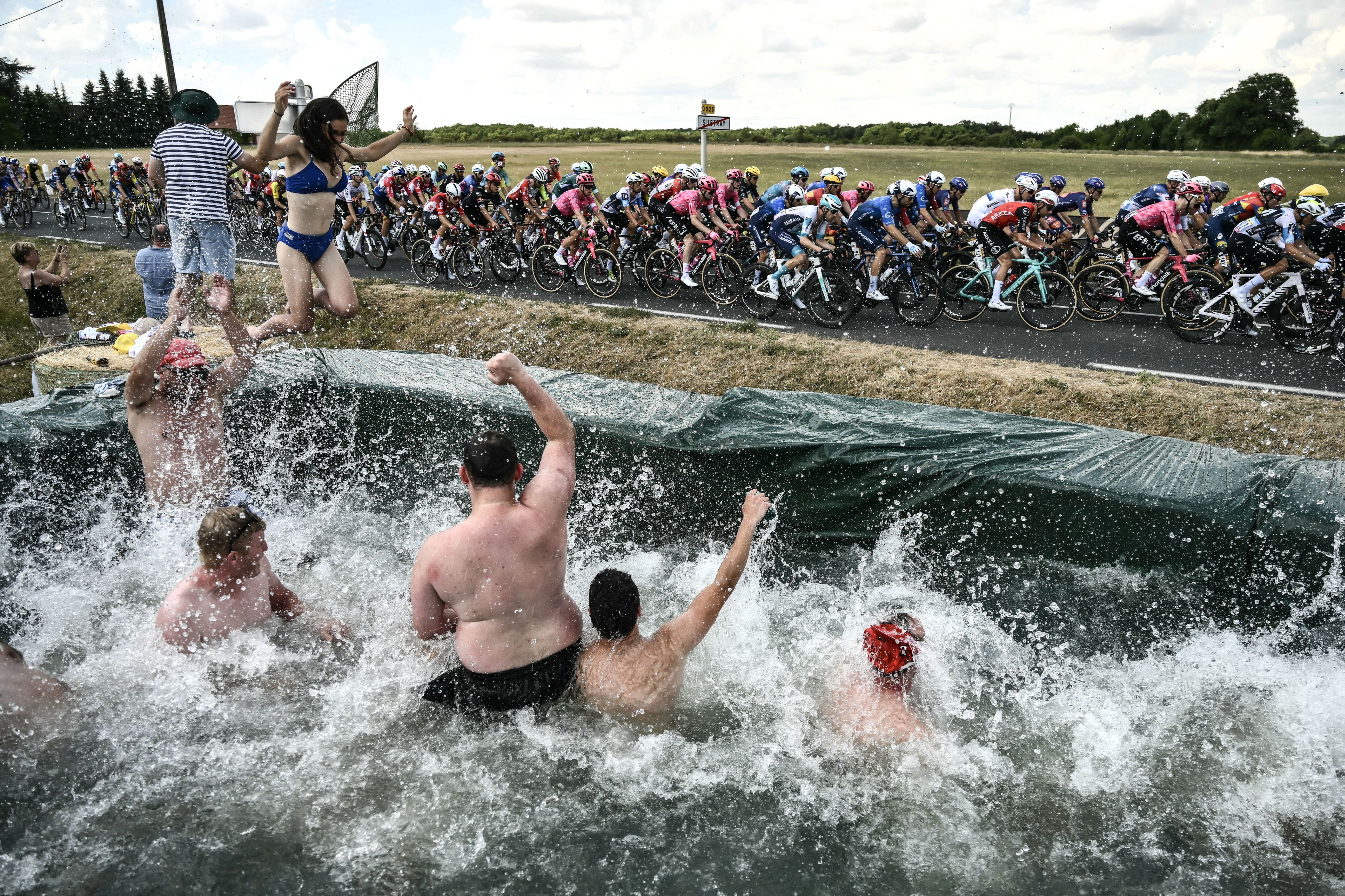 Spectators jump in a makeshift swimming pool set up along the race route as the pack of riders (peloton) cycles past, during the 9th stage of the 112th edition of the Tour de France cycling race, 174.1 km between Chinon and Chateauroux, central France, on July 13, 2025. (Photo by Marco Bertorello/AFP Photo)