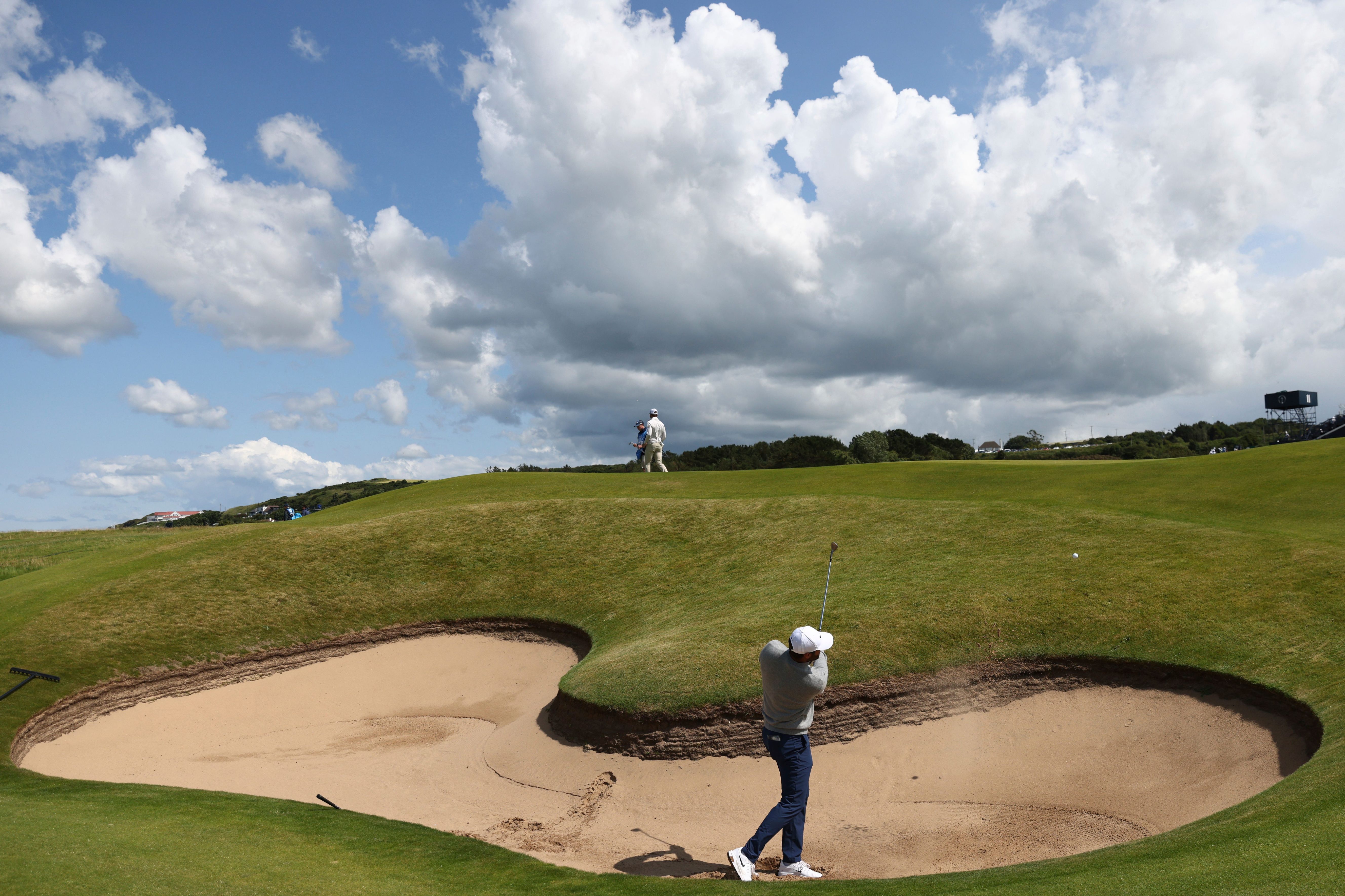 Scottie Scheffler of the United States plays out of a bunker on the 16th hole during a practice round for the 2025 British Open golf championship at the Royal Portrush Golf Club, Northern Ireland, Monday, July 14, 2025. (Photo by Peter Morrison/AP Photo)