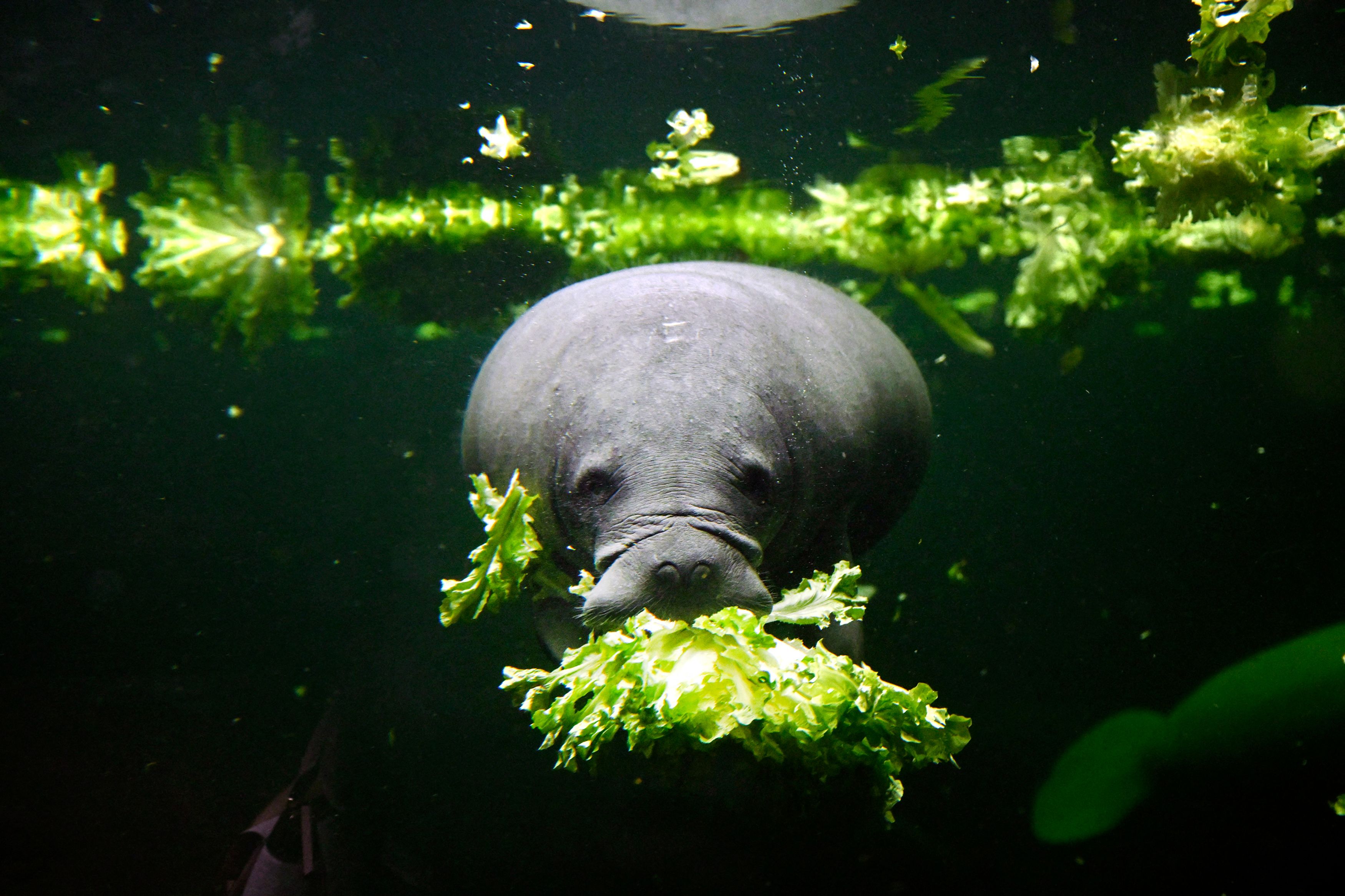 A sea cow eats salad in its enclosure at the Duisburg Zoo, western Germany on July 9, 2025. The Duisburg Dolphinarium celebrates its 60th anniversary and is now one of the most modern facilities for bottlenose dolphins in Europe with a clear educational, research and conservation mission as well as an important role in international dolphin protection work. (Photo by Ina Fassbender/AFP Photo)