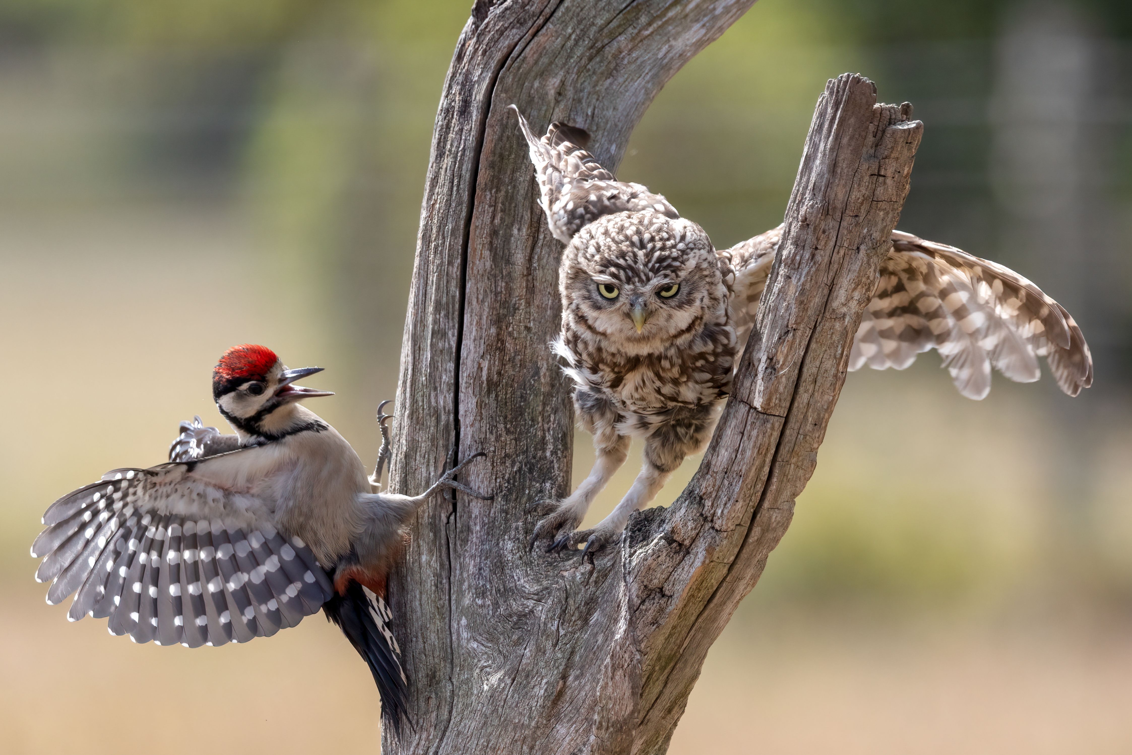 A woodpecker and an owl bicker on a tree branch near Bromsgrove in the West Midlands, UK in the second decade of July 2025. The photographer says the juvenile woodpecker, with a red crown, poked the owl in the eye before flying off. (Photo by Julie Yates/Solent News & Photo Agency)