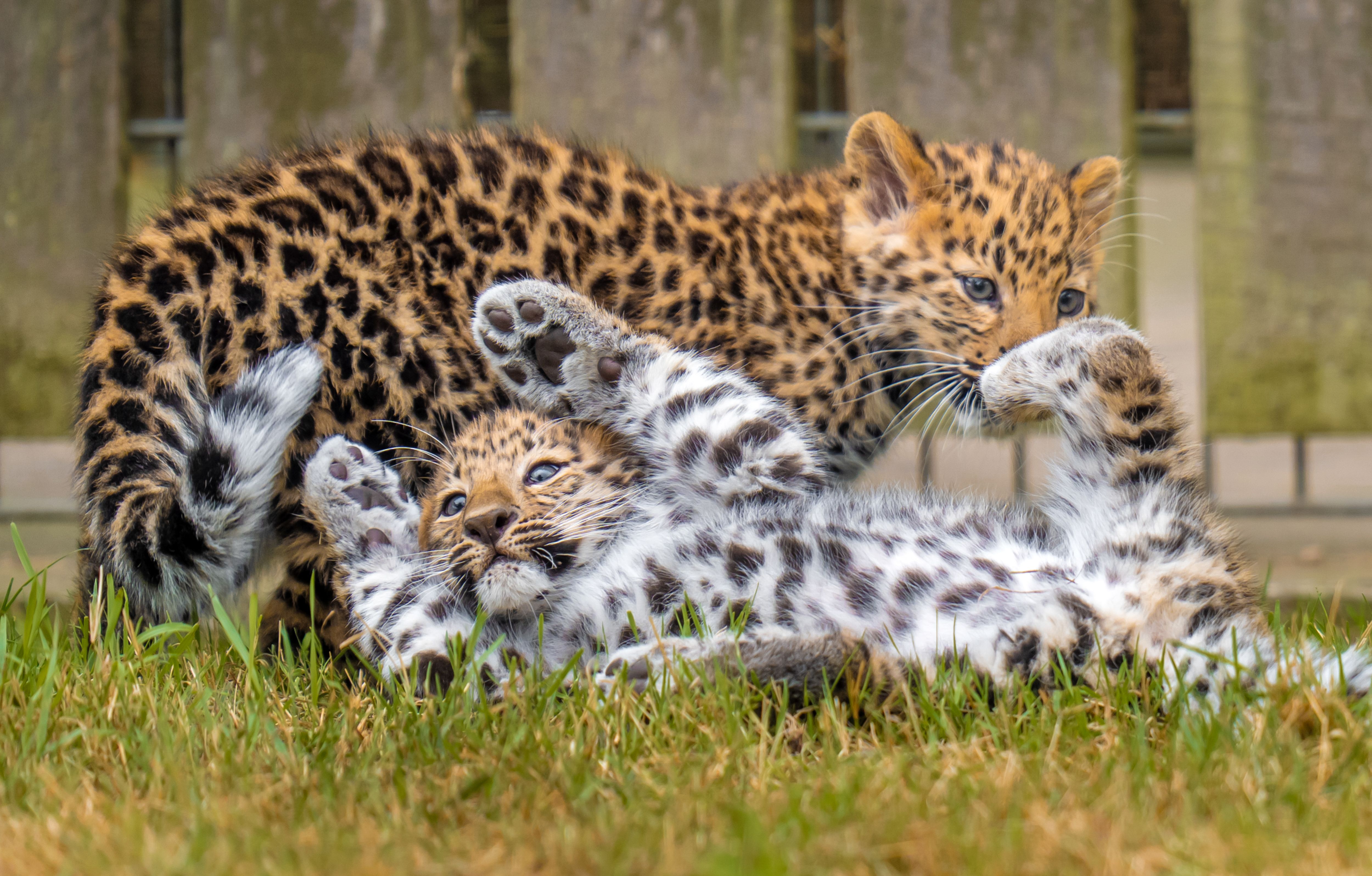 An Amur Leopard cub duo, who have not been names yet, take their first steps into their junior reserve at Yorkshire Wildlife Park, in Doncaster, UK on Thursday, July 17, 2025, which has welcomed two new sets of large cat cubs in the last few months. Born in May to mum, Kristen, and dad, Drake, the newborn cubs have been sheltering in their den for the past 2 months. (Photo by Danny Lawson/PA Images via Getty Images)