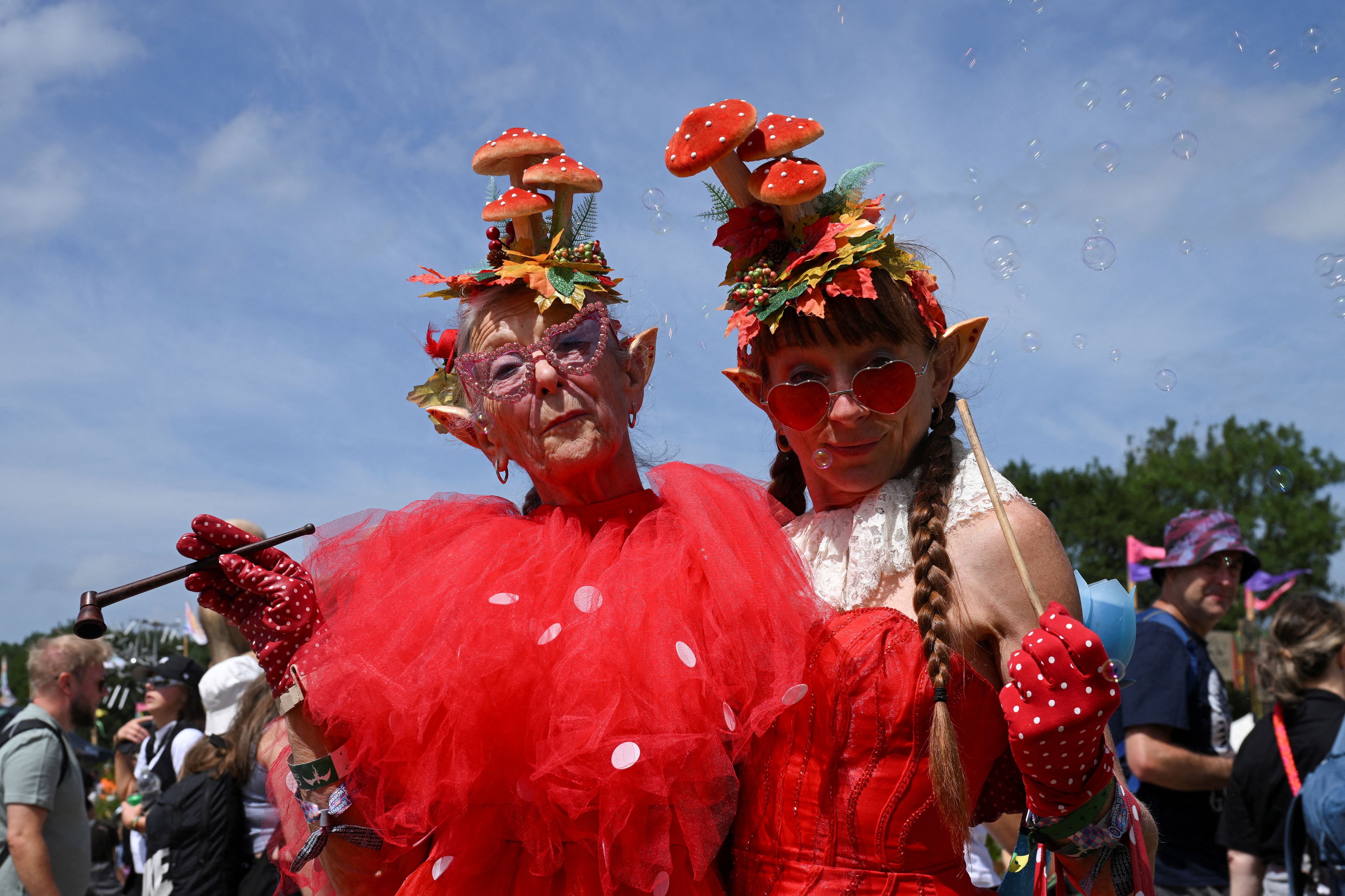 Revellers pose for a photo as they attend Glastonbury Festival at Worthy Farm in Pilton, Somerset, Britain, on June 26, 2025. (Photo by Jaimi Joy/Reuters)