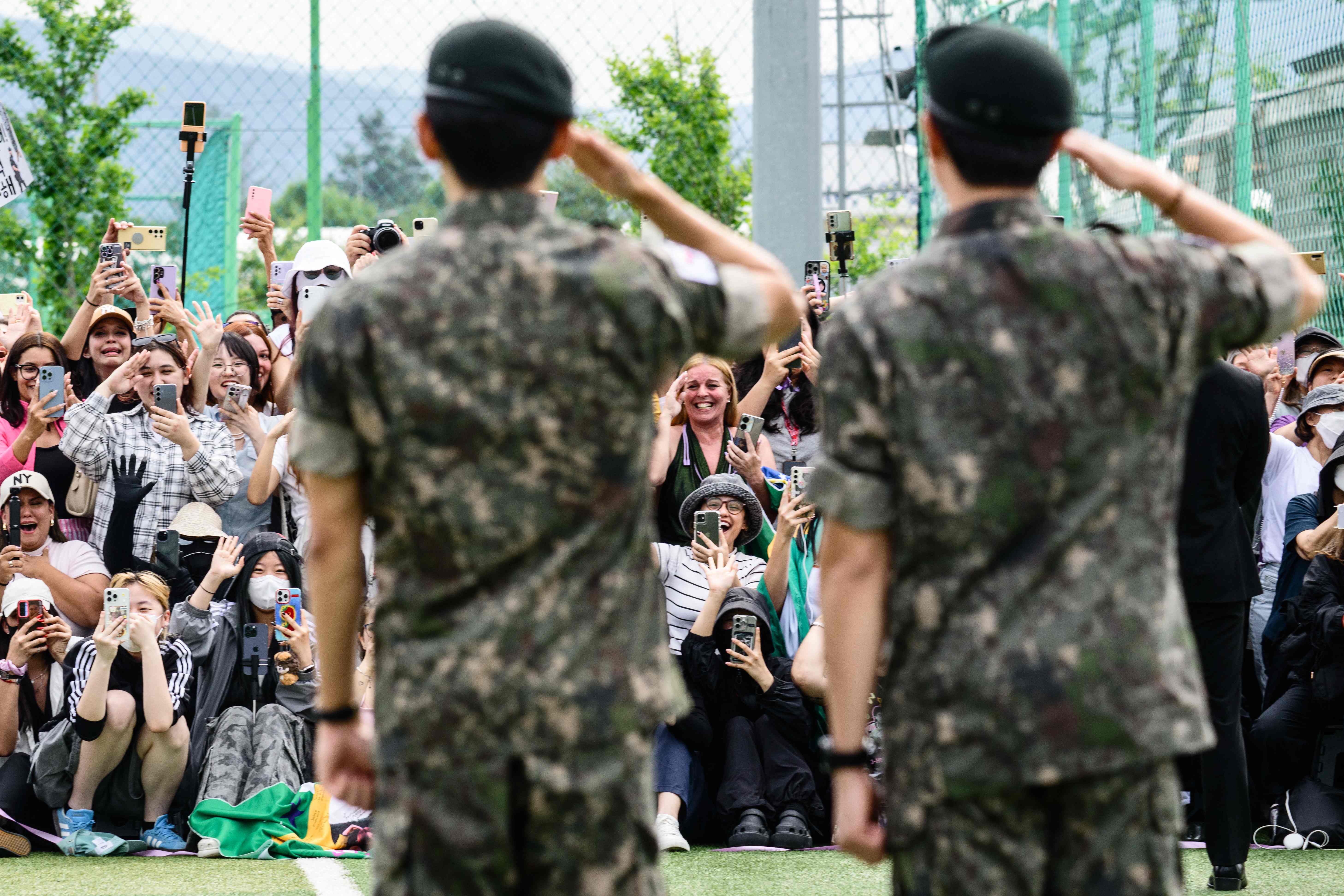 Fans react as K-pop boy band BTS members RM (foreground R) and V salute toward them at an outdoor sporting facility in Chuncheon on June 10, 2025, after their release from 18 months of South Korean military service. Hundreds of fans gathered near two army bases just outside of the capital Seoul where band leader RM -- recently named “Favorite K-pop Artist” at the American Music Awards – and singer V were discharged. (Photo by Anthony Wallace/AFP Photo)