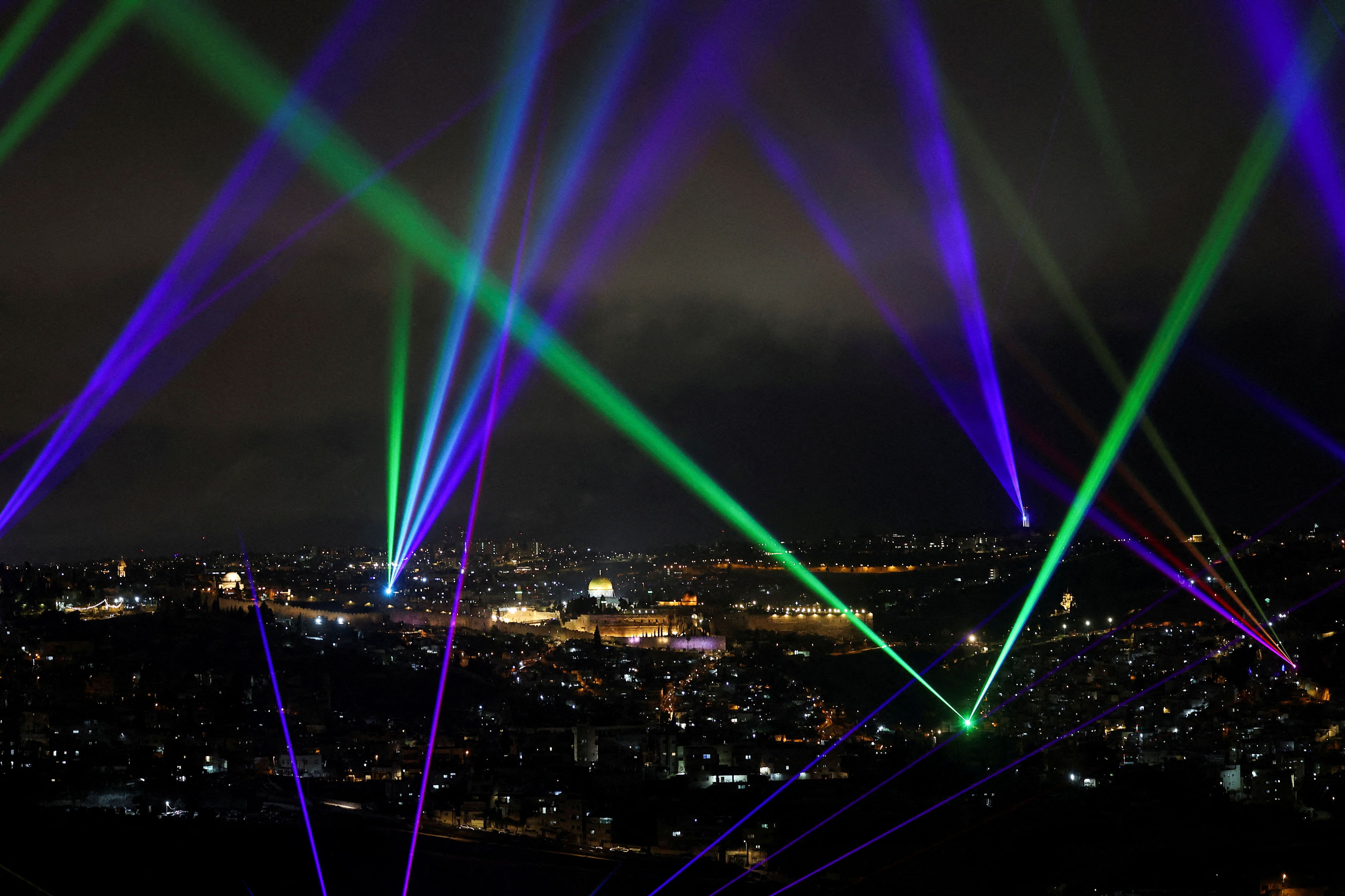 Colourful lasers illuminate the sky above Jerusalem as part of a display longing for peace and harmony, amid the ongoing conflict in Gaza between Israel and Hamas, in Jerusalem on March 18, 2024. (Photo by Ronen Zvulun/Reuters)