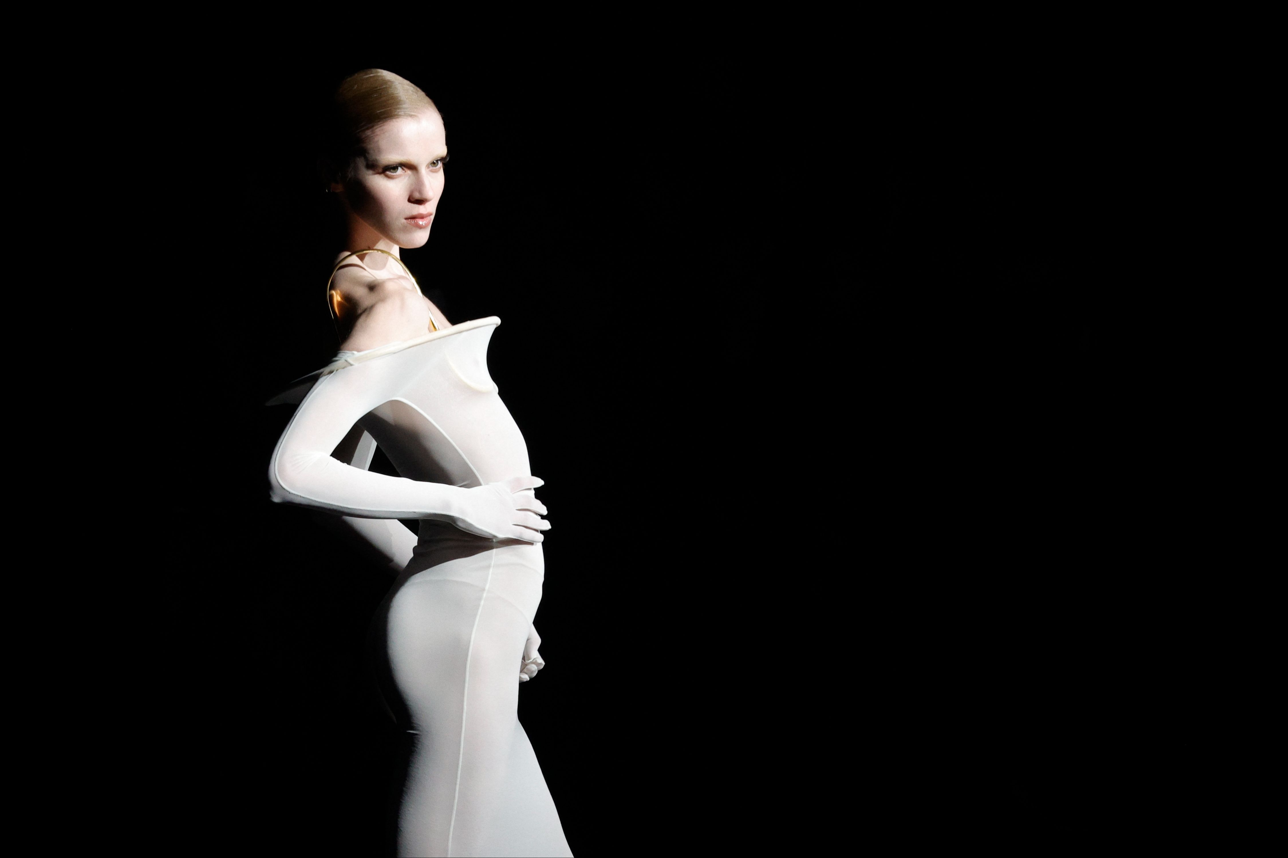 A model presents a creation by Mugler for the Women Ready-to-wear Fall-Winter 2024/2025 collection as part of the Paris Fashion Week, in Paris on March 3, 2024. (Photo by Geoffroy Van der Hasselt/AFP Photo)